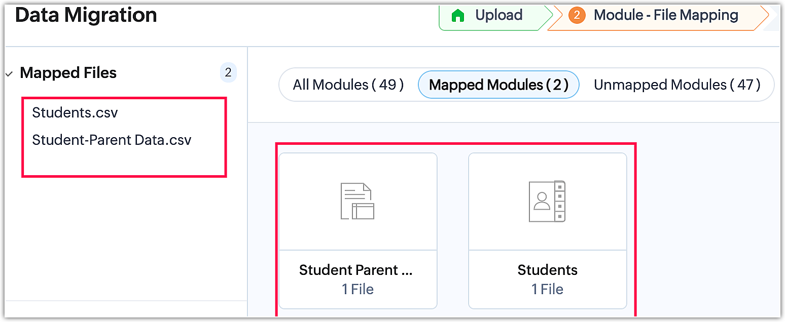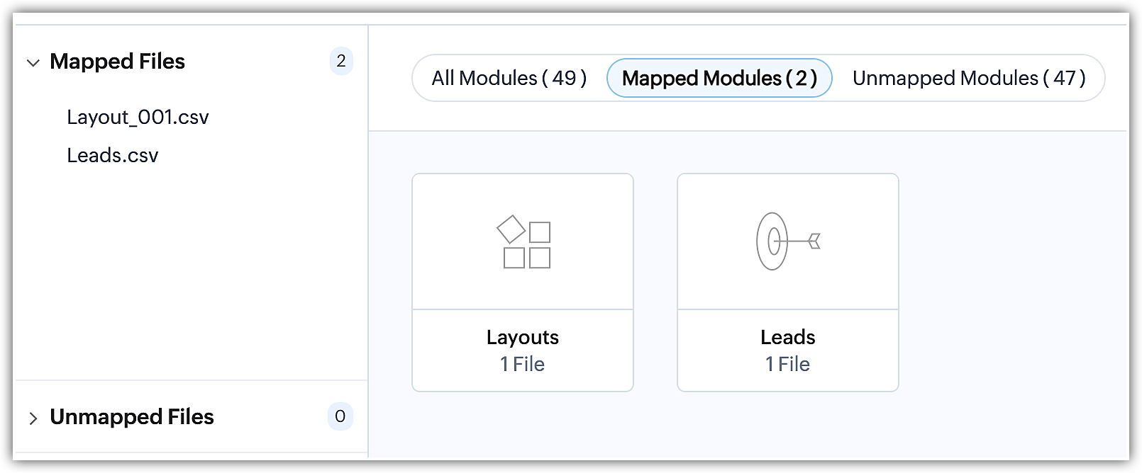 On the other hand, unmapped files are files that contain data but have not yet been linked to an existing module or created as a custom module during the module mapping stage. Furthermore, any irrelevant files uploaded alongside a group of files or within a zip file will be recognized as unmapped files by the system during the migration process.