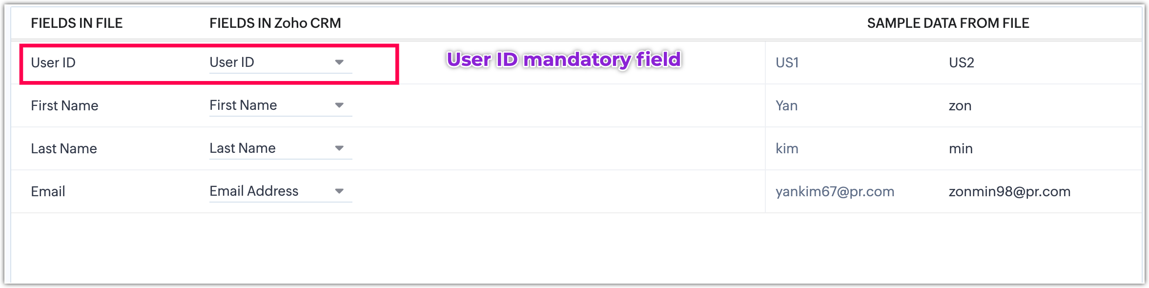 User .csv file should contain first name, last name, email and user Id within it. Here, in the below table you can see that the owner Id is 00U1, 00U2, 00U3, etc,.