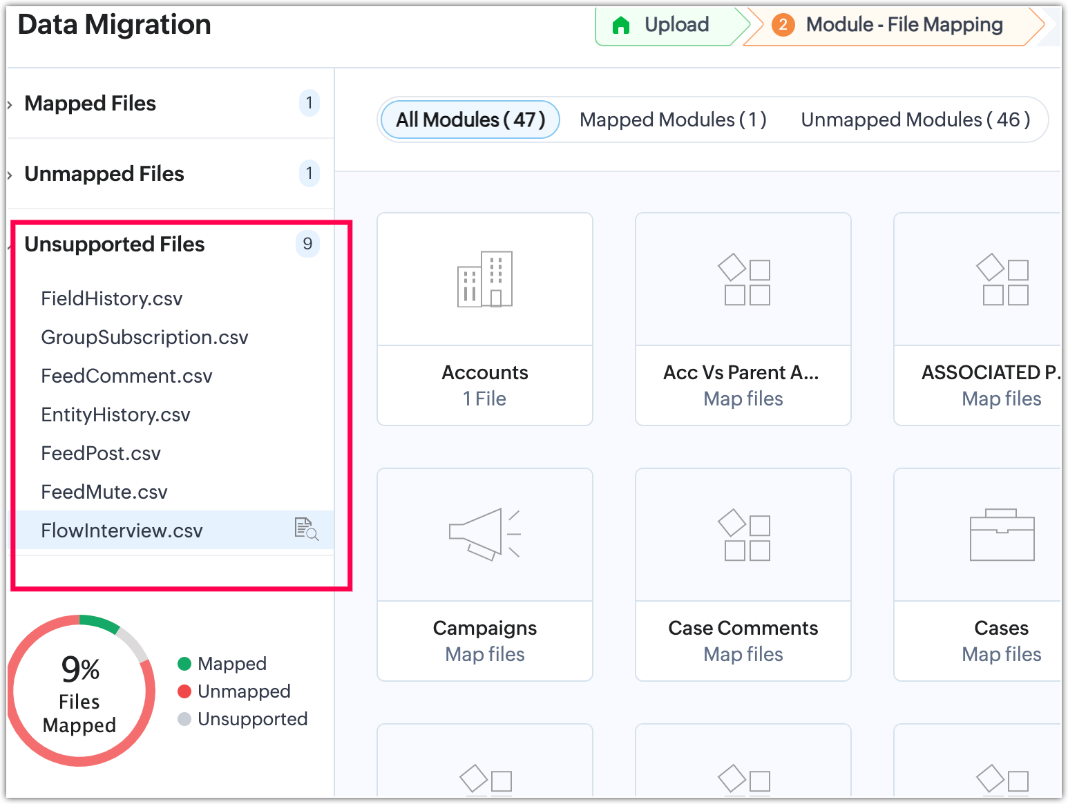 Unsupported files refer to files that do not contain any data and are therefore unsuitable for migration purposes. Additionally, if a file is corrupted, it will also be classified as unsupported during the module mapping stage.