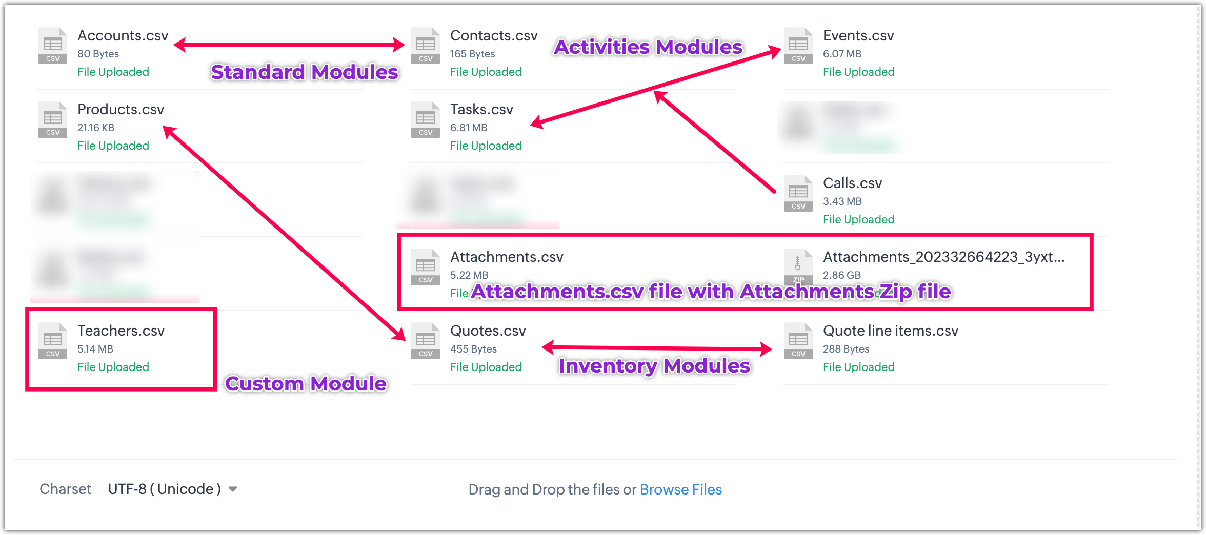 Choose the appropriate CRM widget, and proceed to upload all the required files. You can upload files related to standard modules, activity modules, inventory modules, and custom modules. If you need to upload attachments or documents, please ensure you upload both the Attachments or Documents .CSV file and the corresponding folder containing the attachments or documents, zipped together. This ensures a seamless migration of all necessary data and related files.