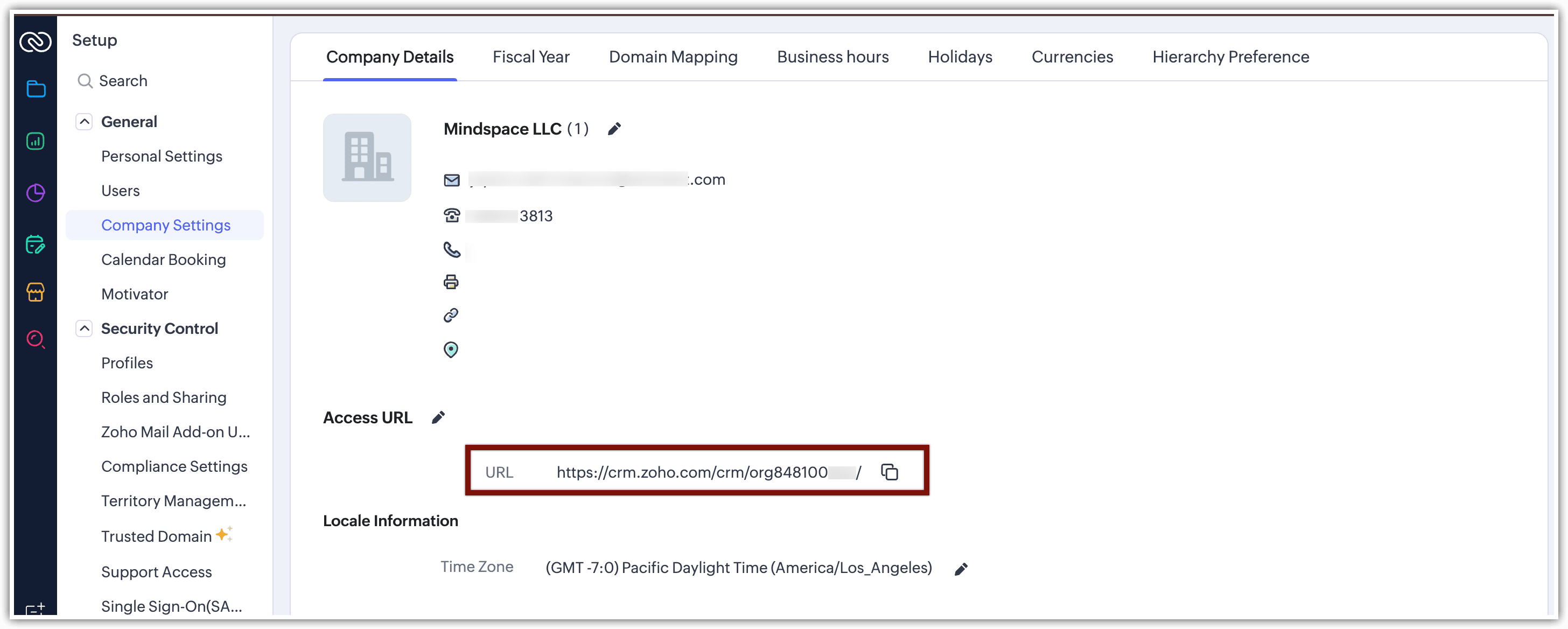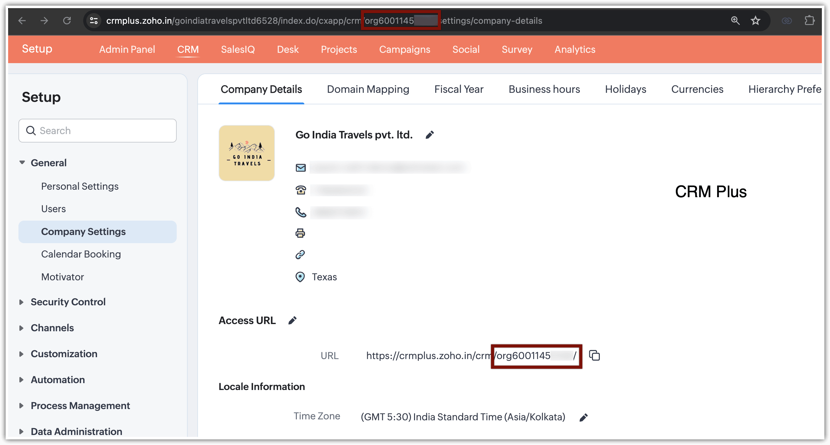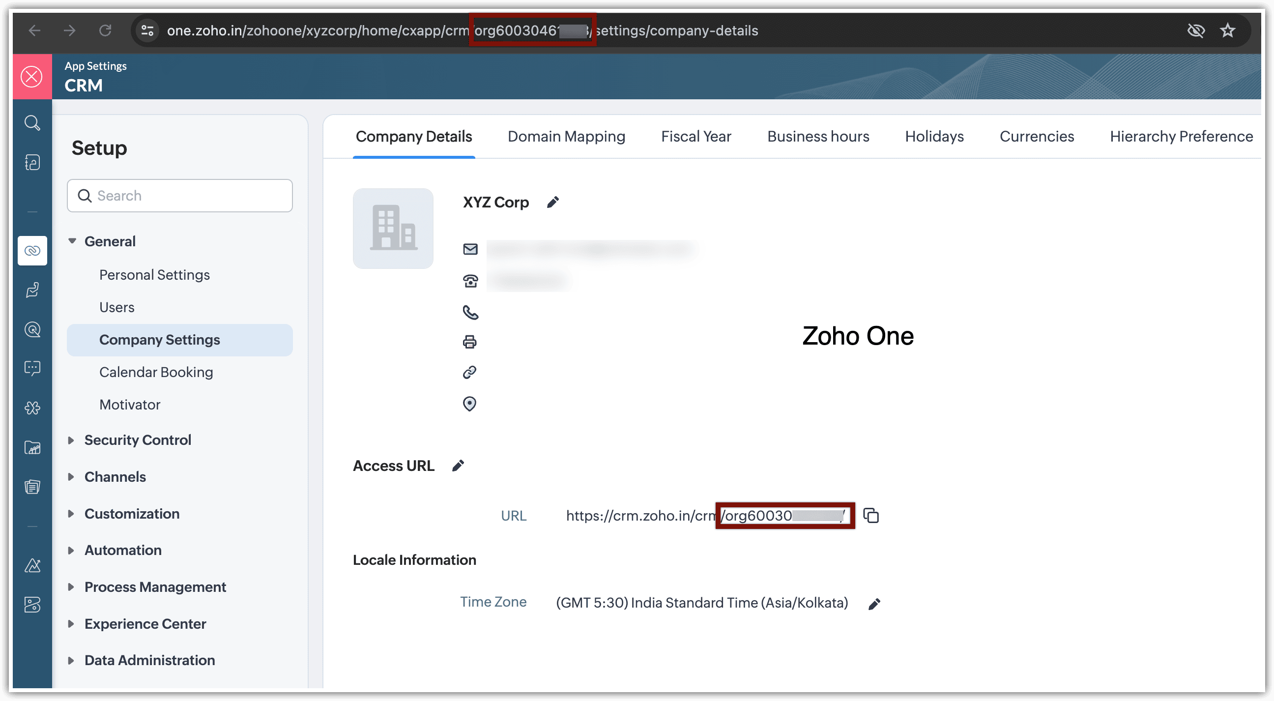To get the Org ID for your CRM account in Zoho One or CRM Plus, navigate to Setup > General > Company Setting > Company Details > URL > Org(numerical).