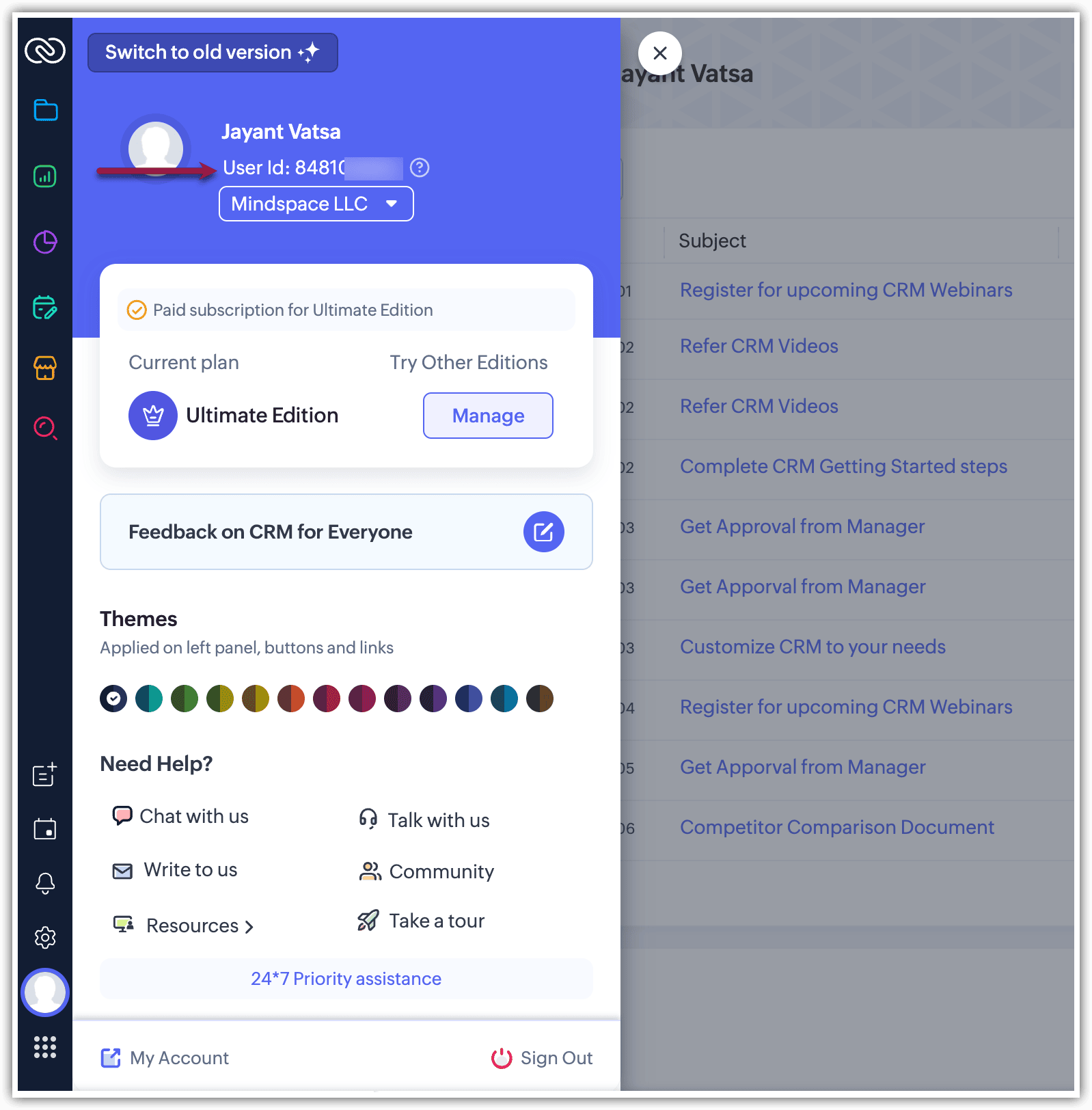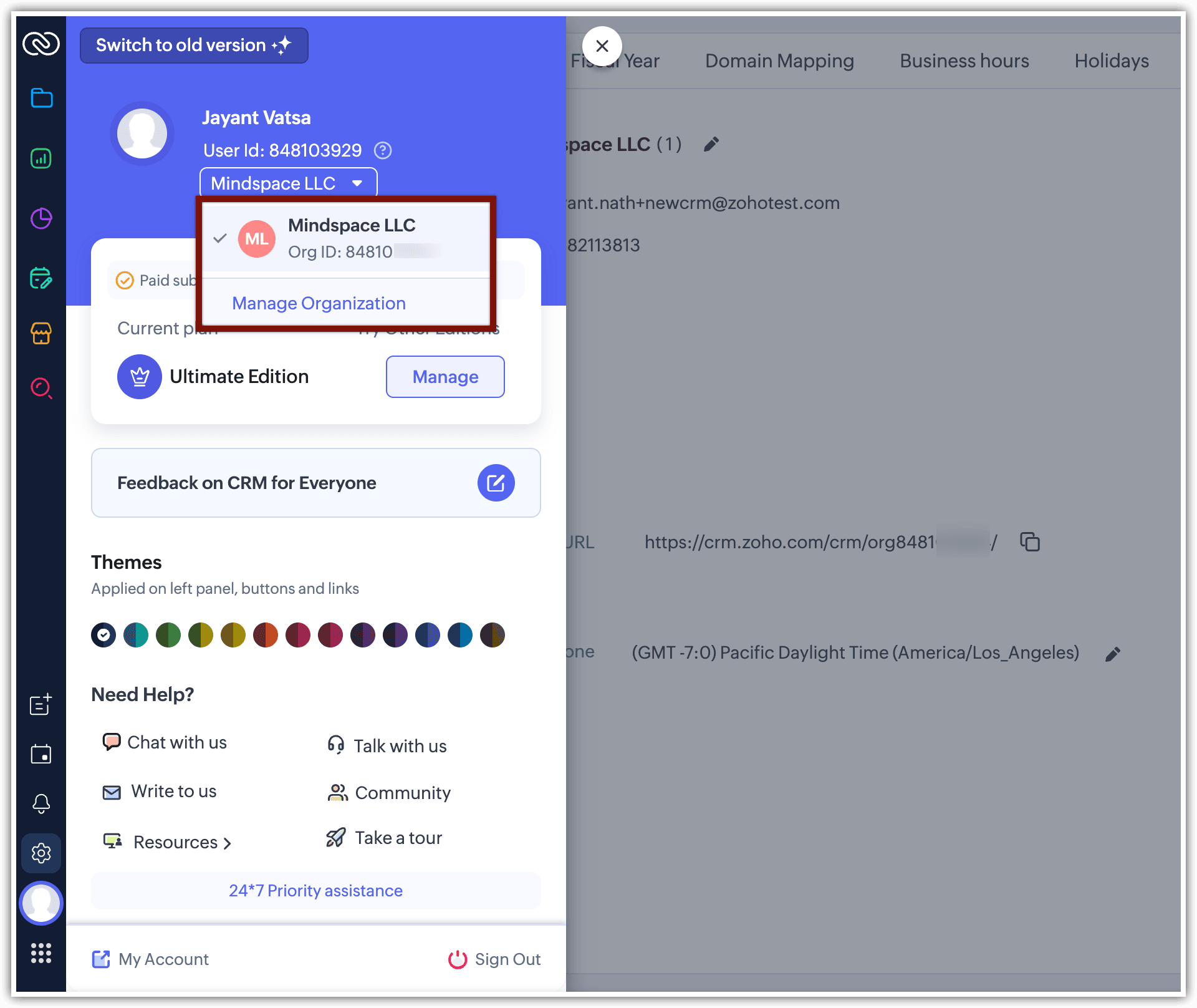 Organization ID by clicking on your profile picture at the bottom-left corner of your CRM account. There, you will see the name of your organization. Click on the dropdown to view the name of the organization and the