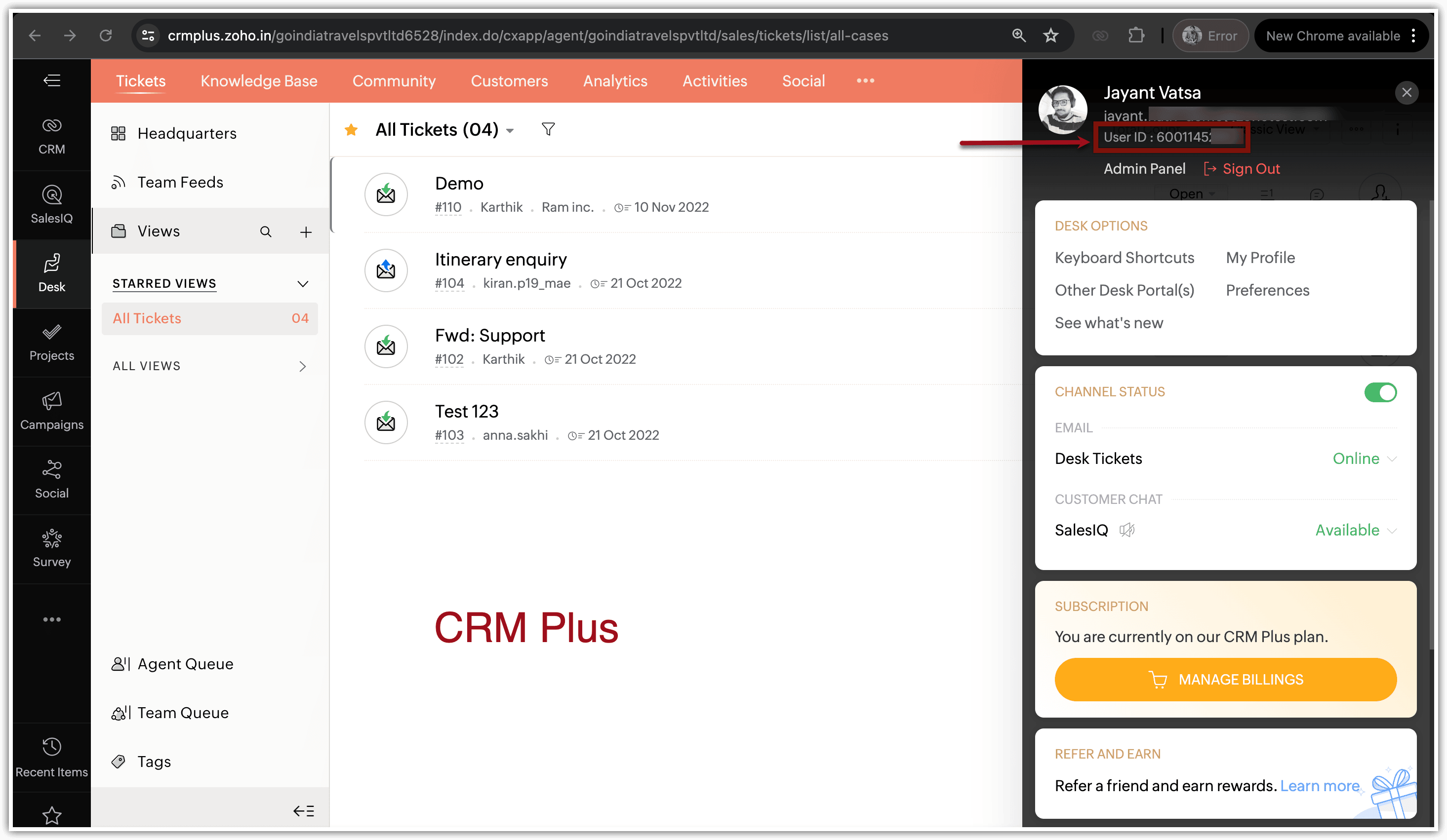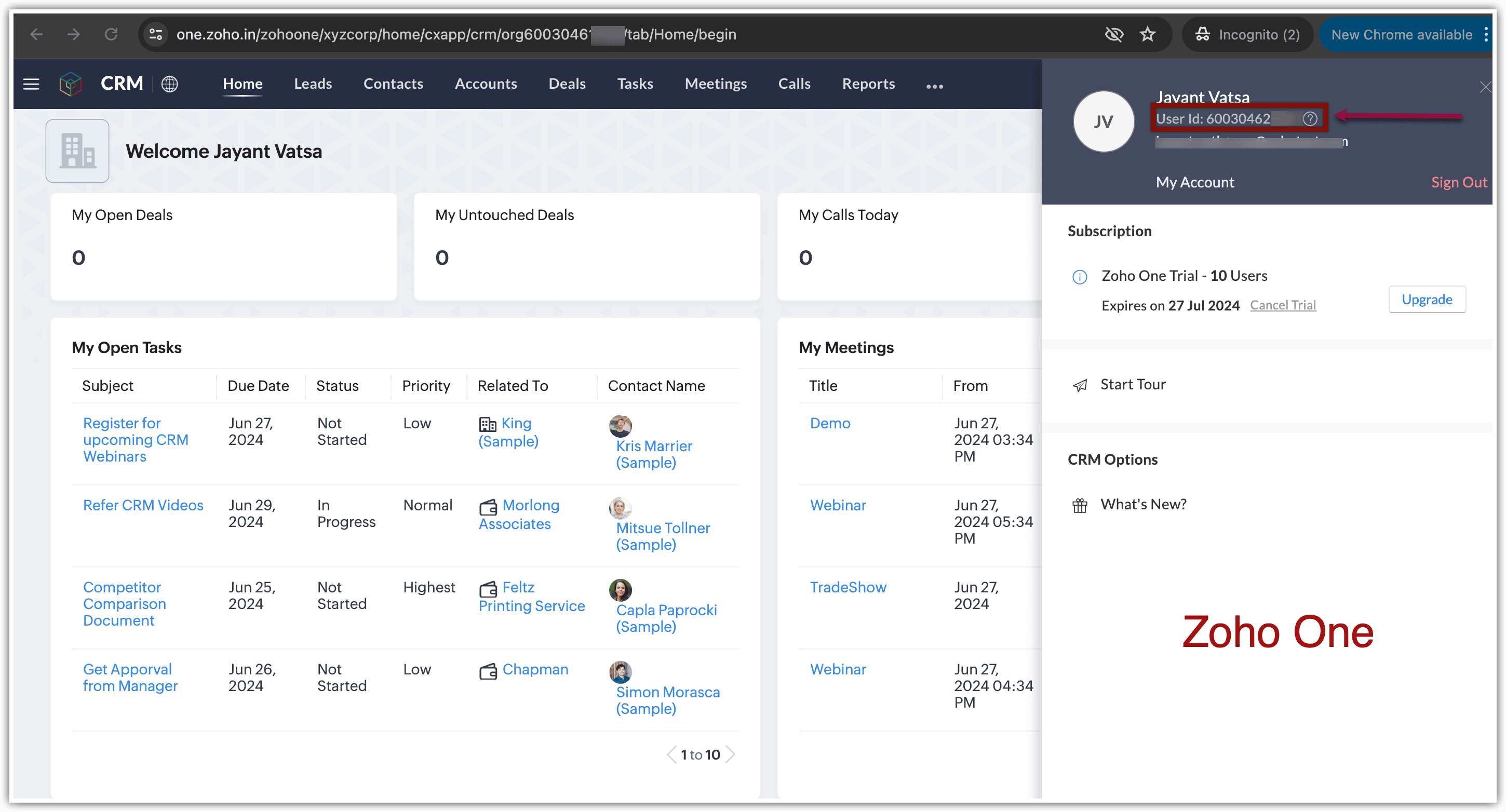 The User ID for a standalone CRM is unique to that CRM often called CRM User ID. However, for bundled CRMs like CRM Plus or Zoho One, a single User ID is shared across all the products in that bundle, such as Zoho Desk, Zoho Projects, Zoho Campaigns, Cliq, Meetings, and others.