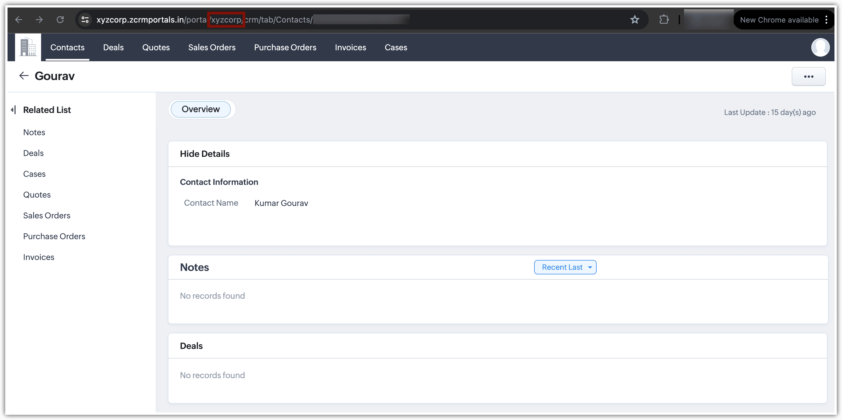 With portals in Zoho CRM, you can invite users, such as contacts, to join. When these users receive an invite and log in to the portal, they will see a URL with a series of numbers, for example: xyzcorp/crm/tab/contacts/74764395. The xyzcorp or the name of the org which you configured while creating your CRM account while creating your CRM account is the user's unique Portal ID. This ID is common for all the users of that very portal.