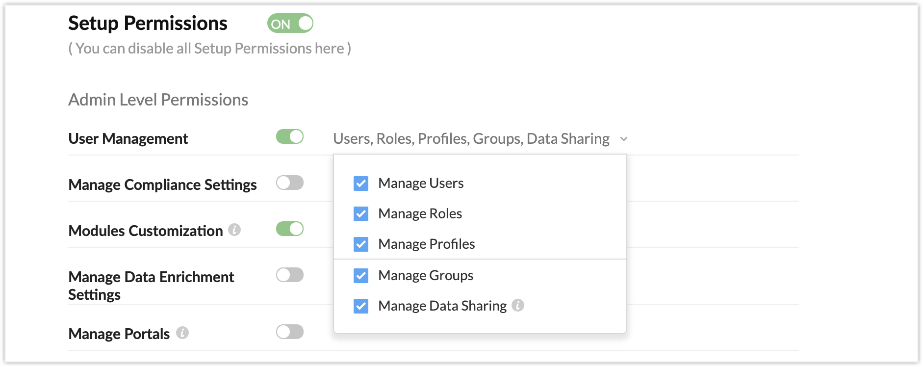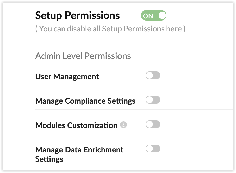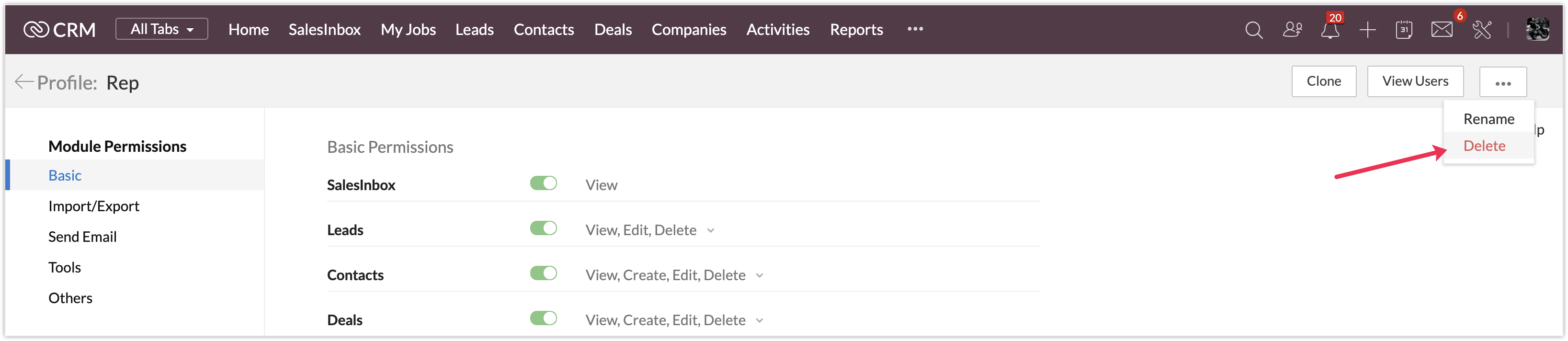 The standard profile has access to the features which will be required to manage daily activities in CRM, for example, they have the permission to view the import history but not to import data to CRM. Likewise, all the admin-level permissions are disabled for the standard profile.