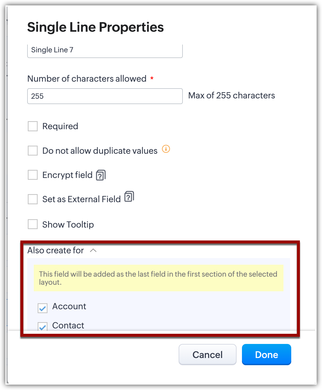 Yes, you can simultaneously create fields in accounts, contacts and deals while creating a custom field in your leads module. This is important because while you are converting your leads to contacts it is tedious to create same fields again in contacts module and then for accounts as well as deals module.