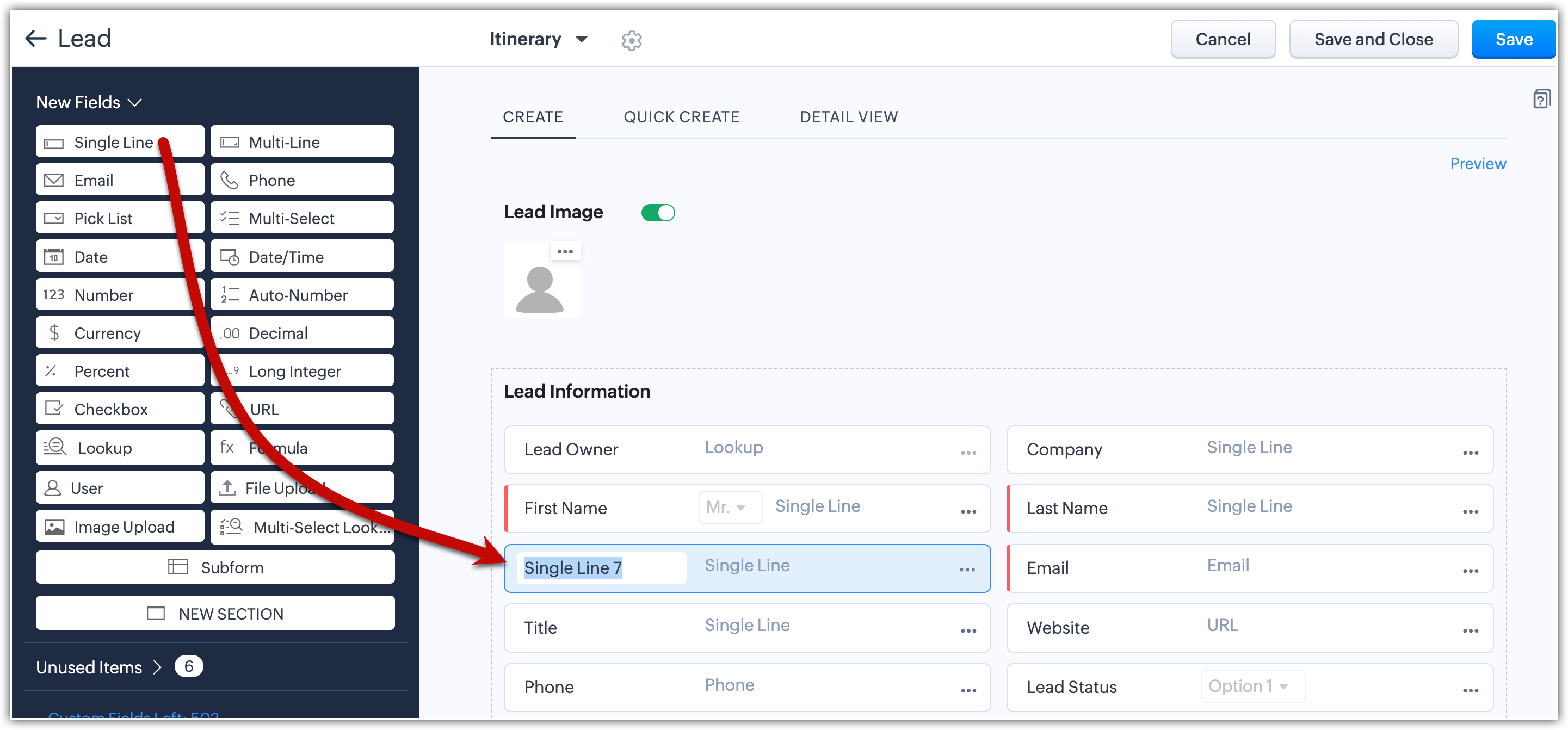 - On the Layout page, Drag and drop your required field type from the list of New Fields.