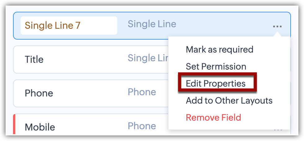 - Specify the custom field details and click on the (...) beside the field name and choose Edit Properties from the list.