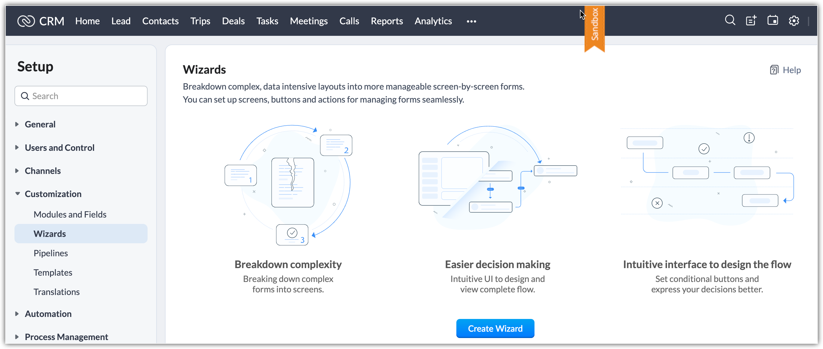 A Wizard helps you divide a long form into a series of screens, where users can enter data on each screen as they proceed to the next step until completion. A step-wise approach is less overwhelming and reduces chances of erroneous data entry, as the partially completed form can be saved as draft and submitted later.