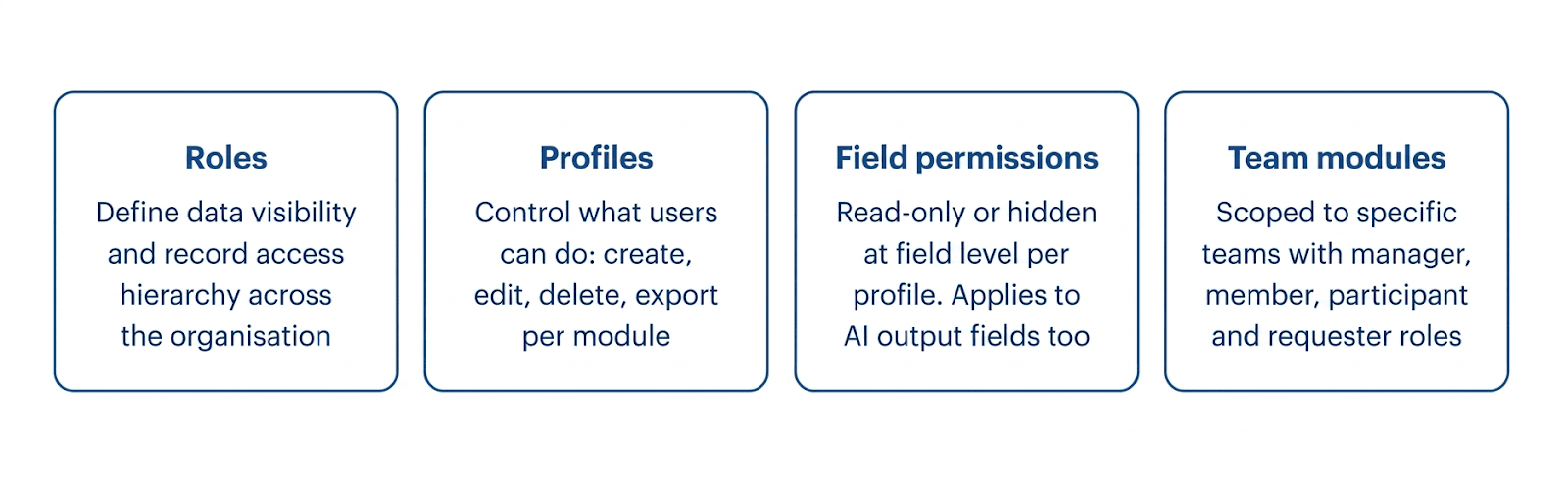 The permission model has four layers working together: roles define what data a user can see based on organisational hierarchy, profiles define what a user can do across modules, field-level permissions make individual fields read-only or hidden per profile, and team modules scope entire modules to specific teams with granular role assignments inside those teams.
