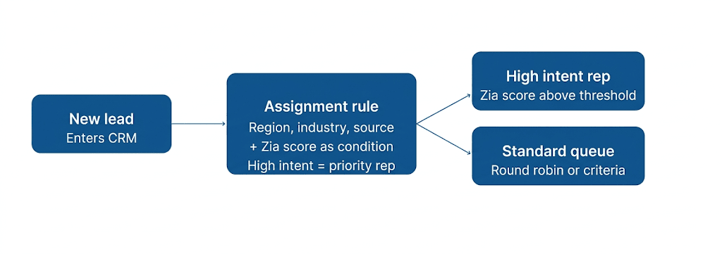 AI in routing: Zia's scoring and predictions can be used directly as conditions inside assignment rules. For example, leads Zia identifies as high intent can be automatically prioritised and routed to senior reps, while lower-scored leads follow standard queue logic. Next Best Experience (NBX) gives admins another layer, allowing them to define rules that combine AI insights with business logic to drive contextual follow-up actions at each deal stage.