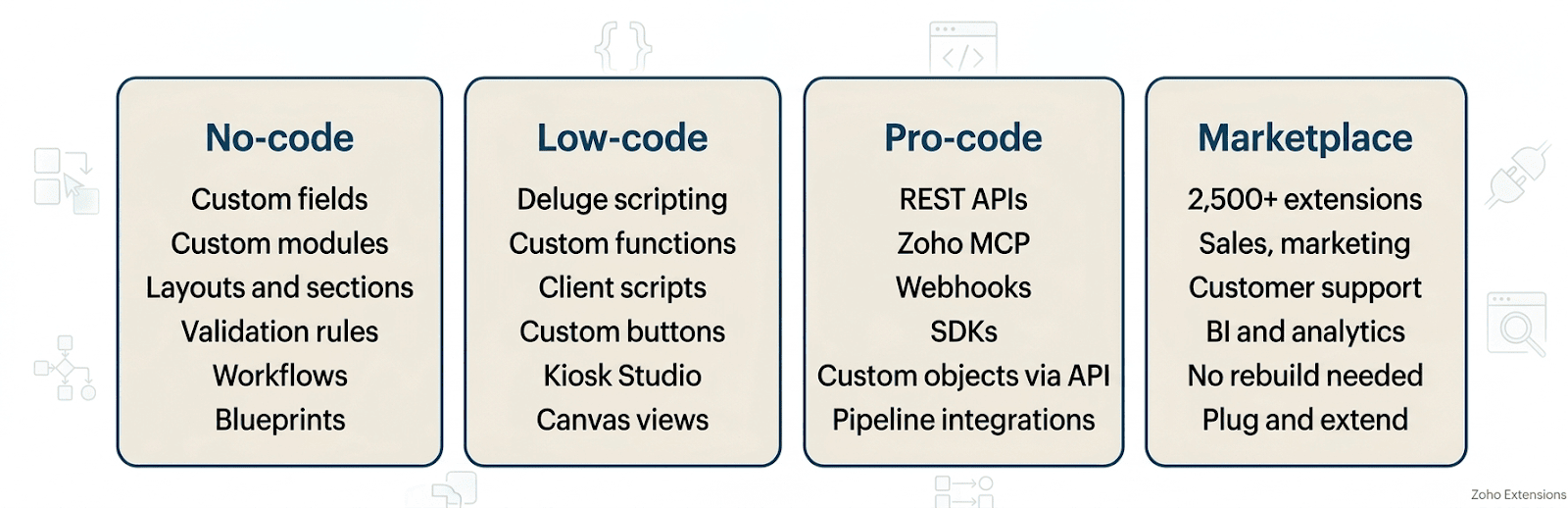 Developers can compose custom objects, Blueprints, and workflows using REST APIs and Zoho MCP, extend the CRM schema with external data sources, and expose predictions and AI outputs back into the CRM via API endpoints.