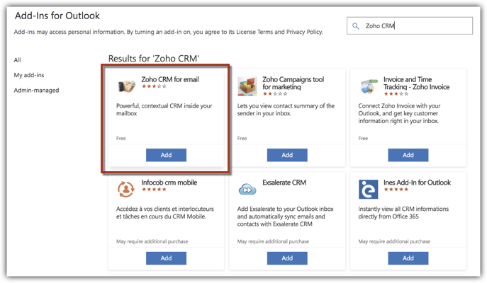 In the search results check for the app Zoho CRM for email, which has Outlook mentioned in the details.