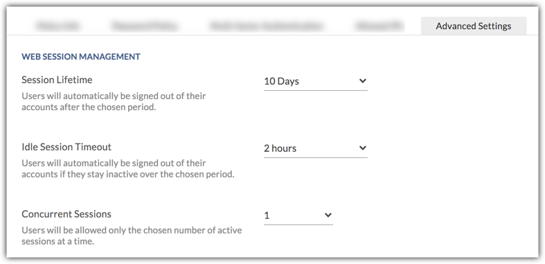 Web session management: Admins can configure advanced form of user authentication by defining the sessions hours, timeouts, and concurrent sessions. These factors give the ability to identify the users on their subsequent accesses and avoid anonymous access. Following session management factors can be configured: