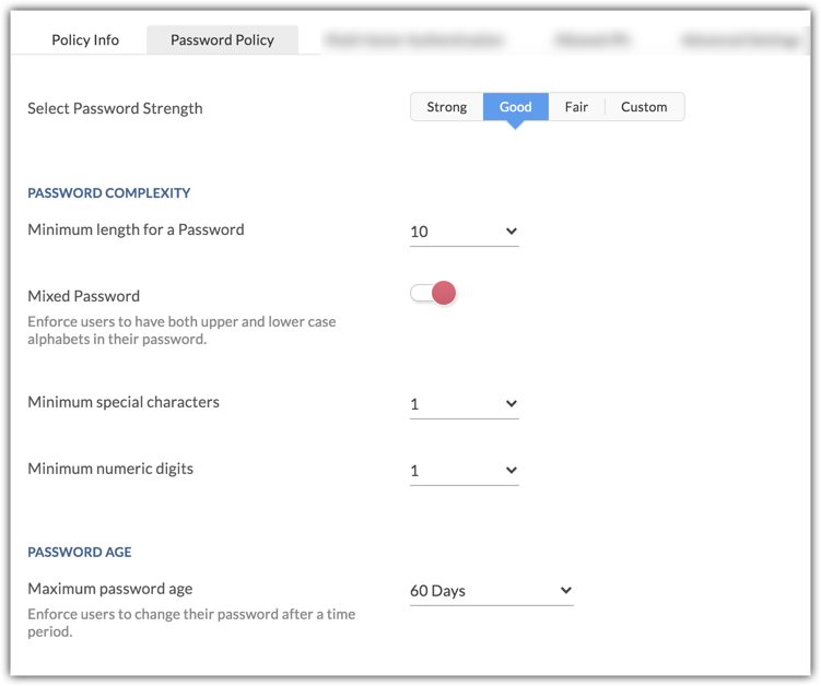 1. Password policy - Set password complexity, expiry date, and password reuse criteria.