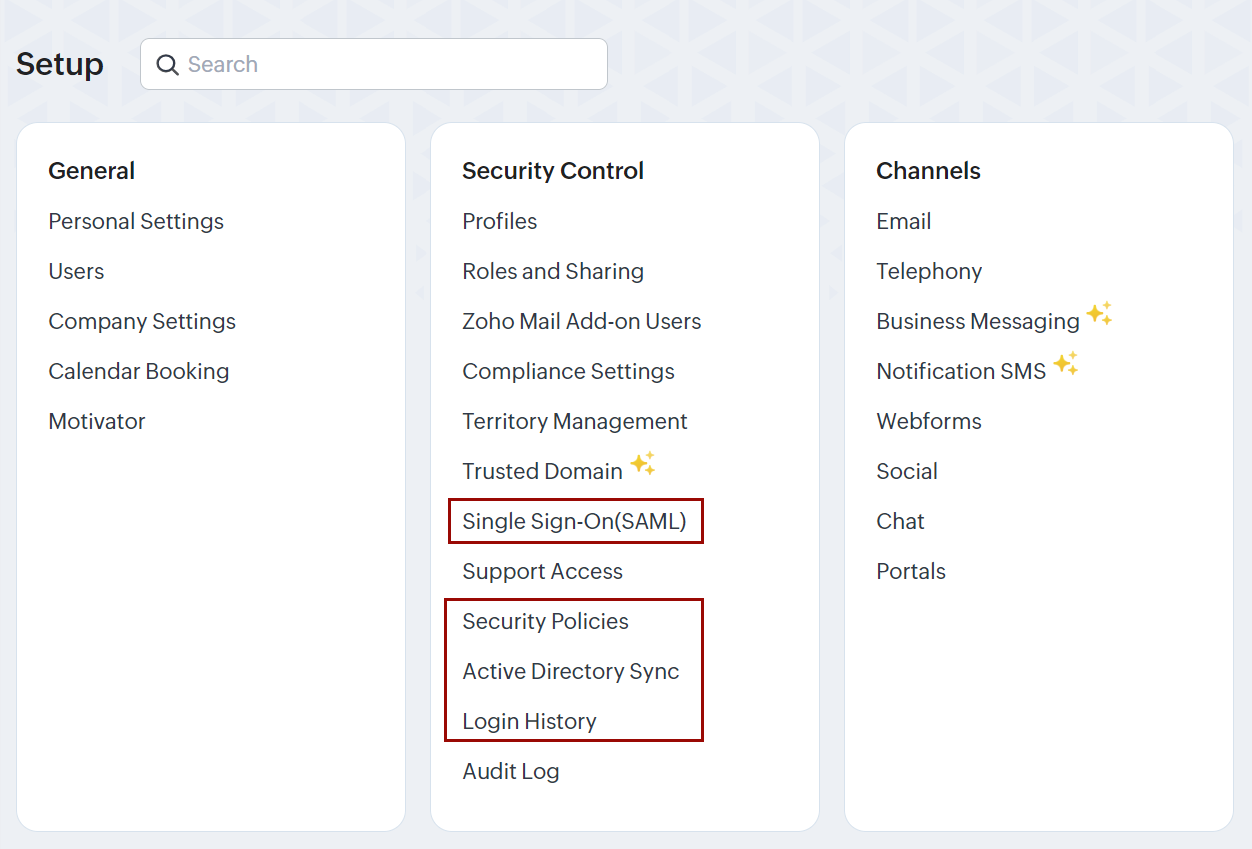 You can access Zoho Directory-related features from the CRM Setup page. They will be available under Security Control.