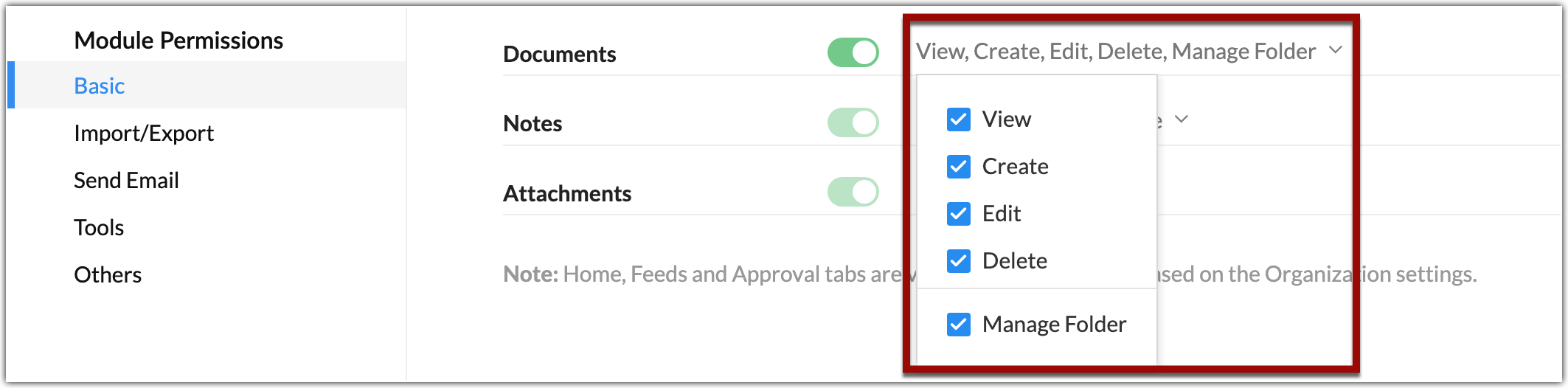 By default, users with Administrator or Standard profile can access this feature. The Administrator needs to provide profile permissions for other users based on which they can access this feature. As mentioned above, documents and their folders have the following set of permissions: