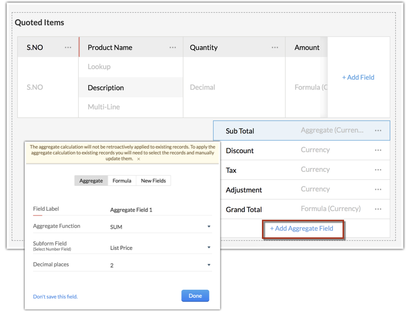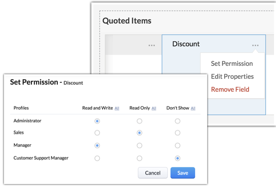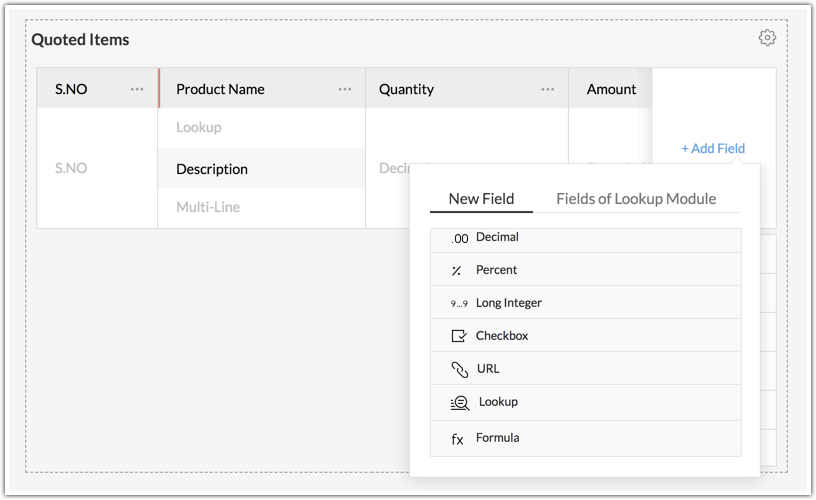 For example, a manufacturing company can include fields like sale price, product recommended retail price, buying price, formula field to calculate profit or discounts, etc. in the Quotes module.