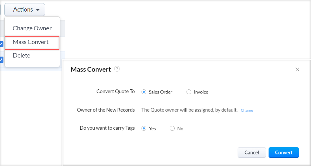 Mass conversion of quotes is also possible in the Quotes module by selecting multiple records from the list view to convert.