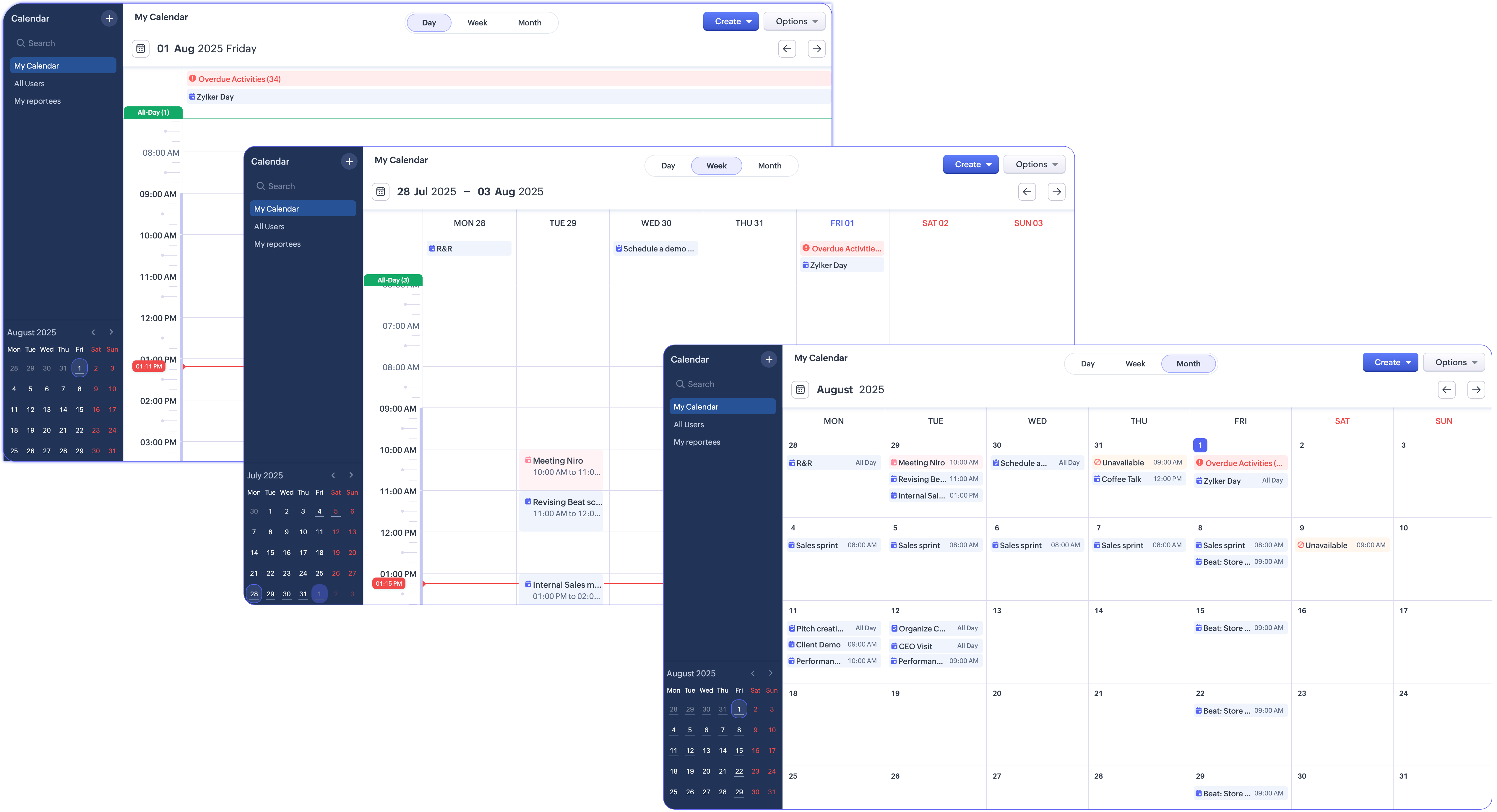 While working with Zoho CRM where all your customers' details are available, you can make use of the built-in calendar for plan your meetings and schedule calls.