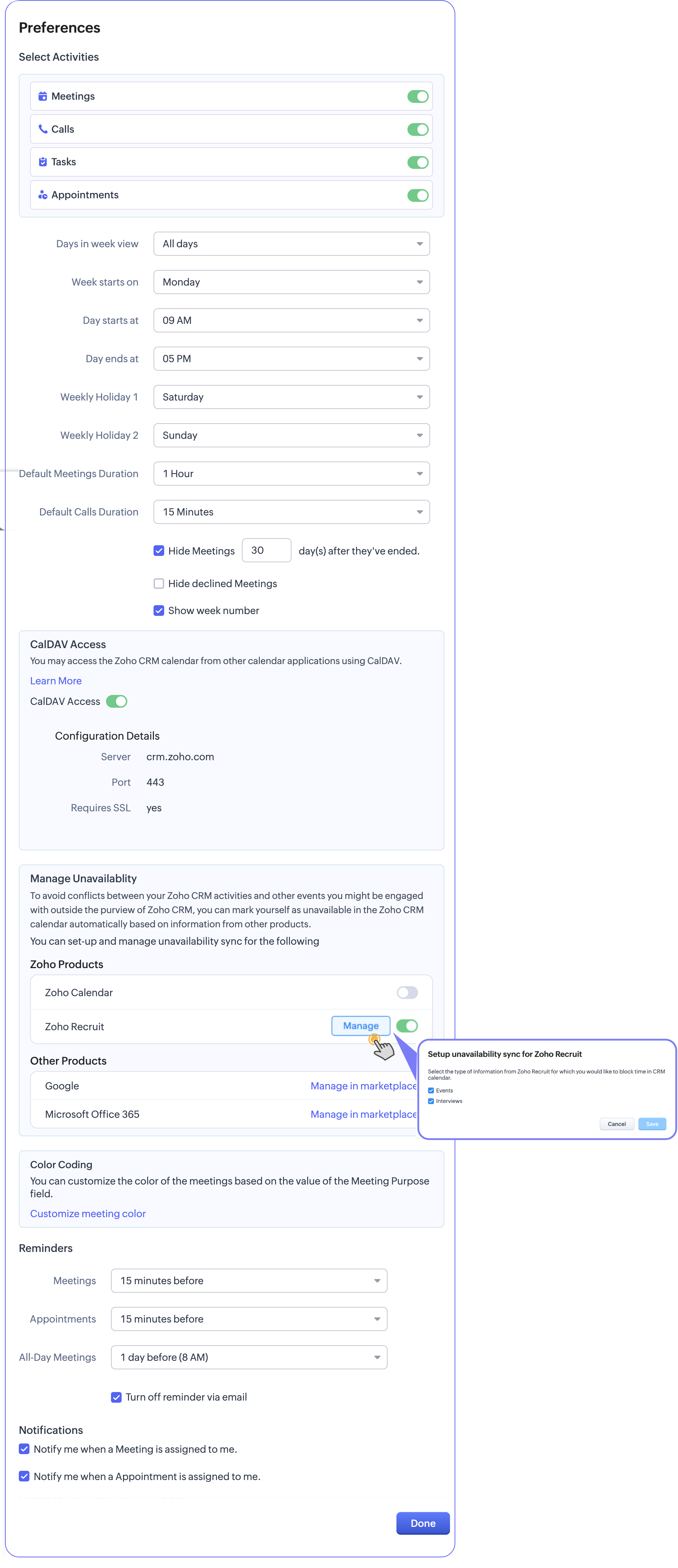 - Under the Manage Unavailability, choose the products to synchronize events from. When the synchronization is enabled, events from the respective products will reserve your schedule in your calendar and mark that event time to be unavailable in CRM. This synchronization will benefit scheduling in Zoho CRM.