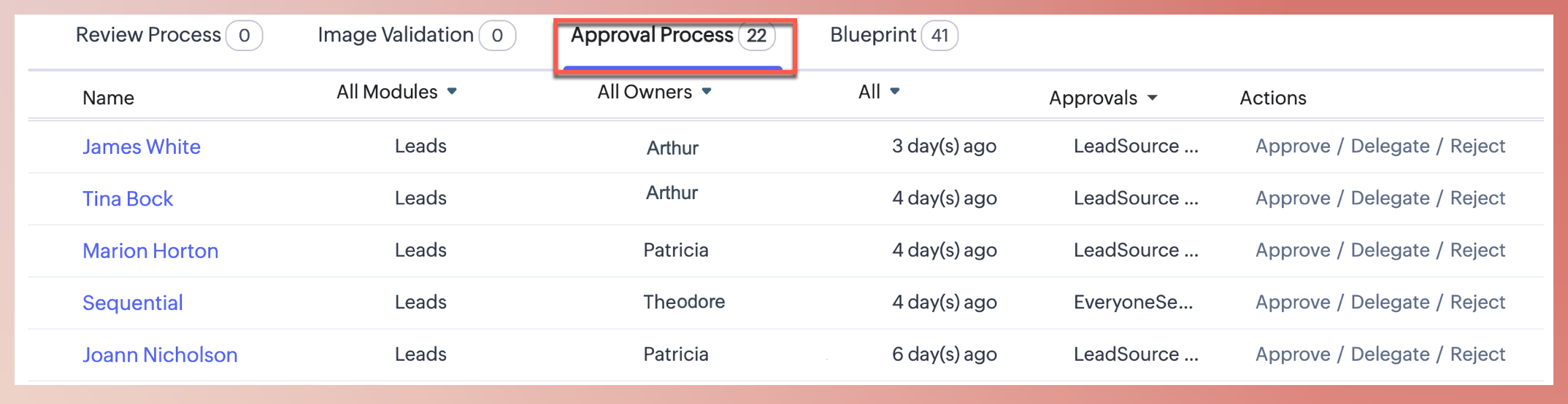 View Pending Approvals - Within the Approval Process tab, you'll find a list of records awaiting your decision—whether to approve, reject, or delegate them to someone else.
