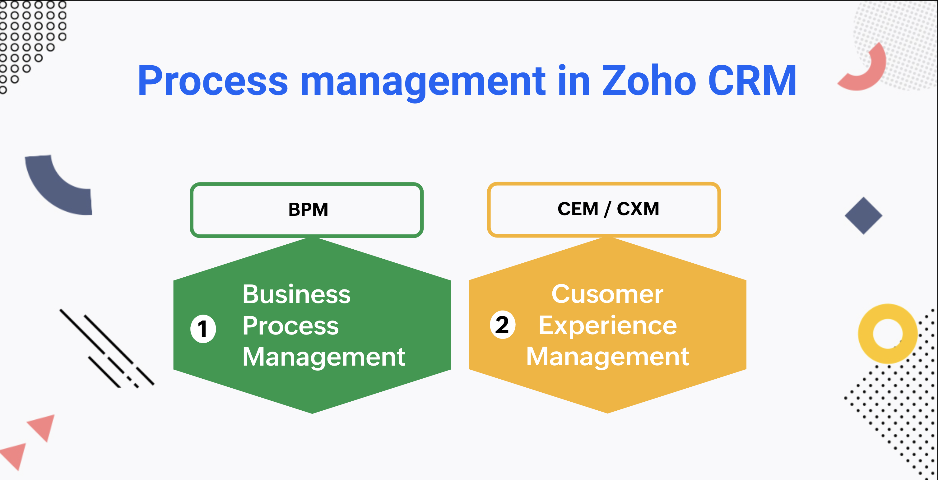 Process management capabilities across Zoho CRM can be categorized, based on their scope, into two major categories— Business process management (BPM) and Customer Experience Management (CEM).