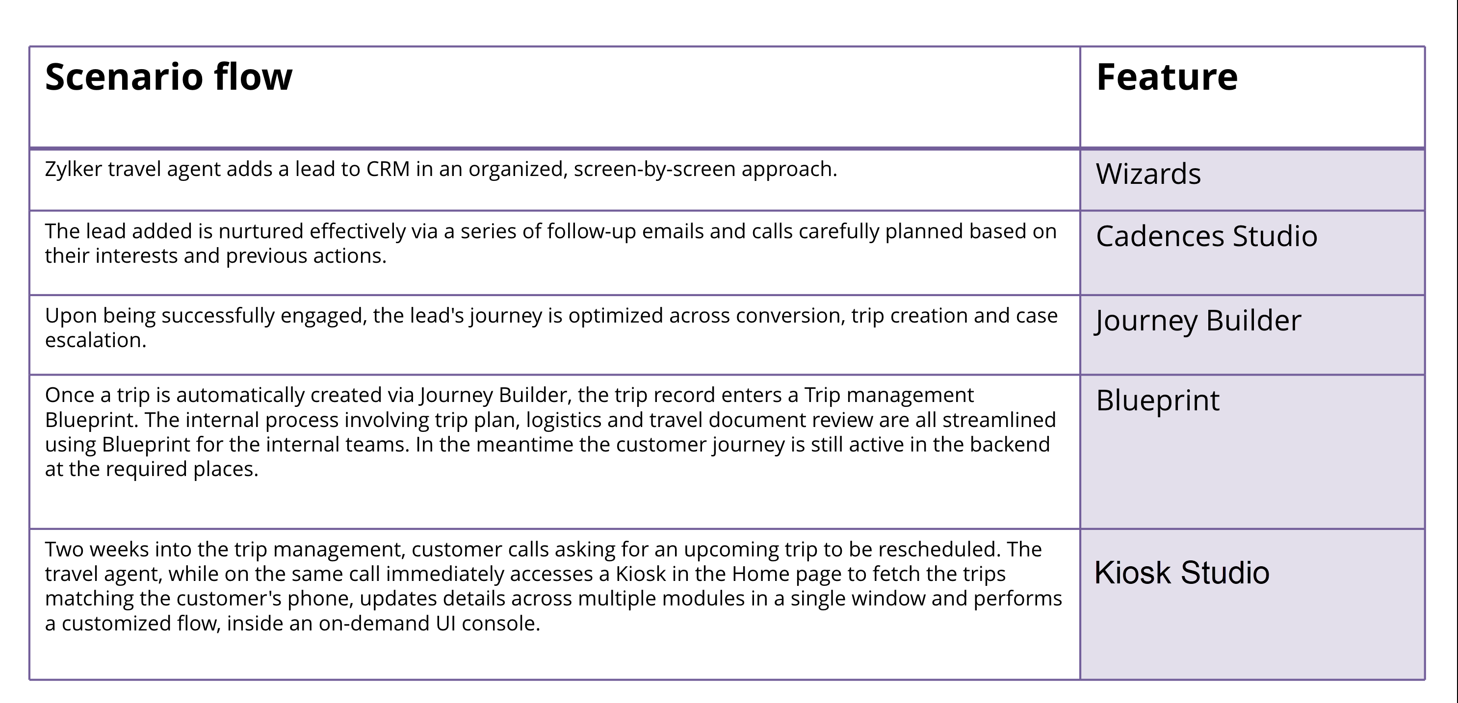 Here is a simple example in which we will put all of these key features in context. Let's consider that Zylker Travels is using Zoho CRM to streamline their travel management needs. Here is a quick example sequence of how they can use all of the above-mentioned functionalities together, in their implementation based on their needs.