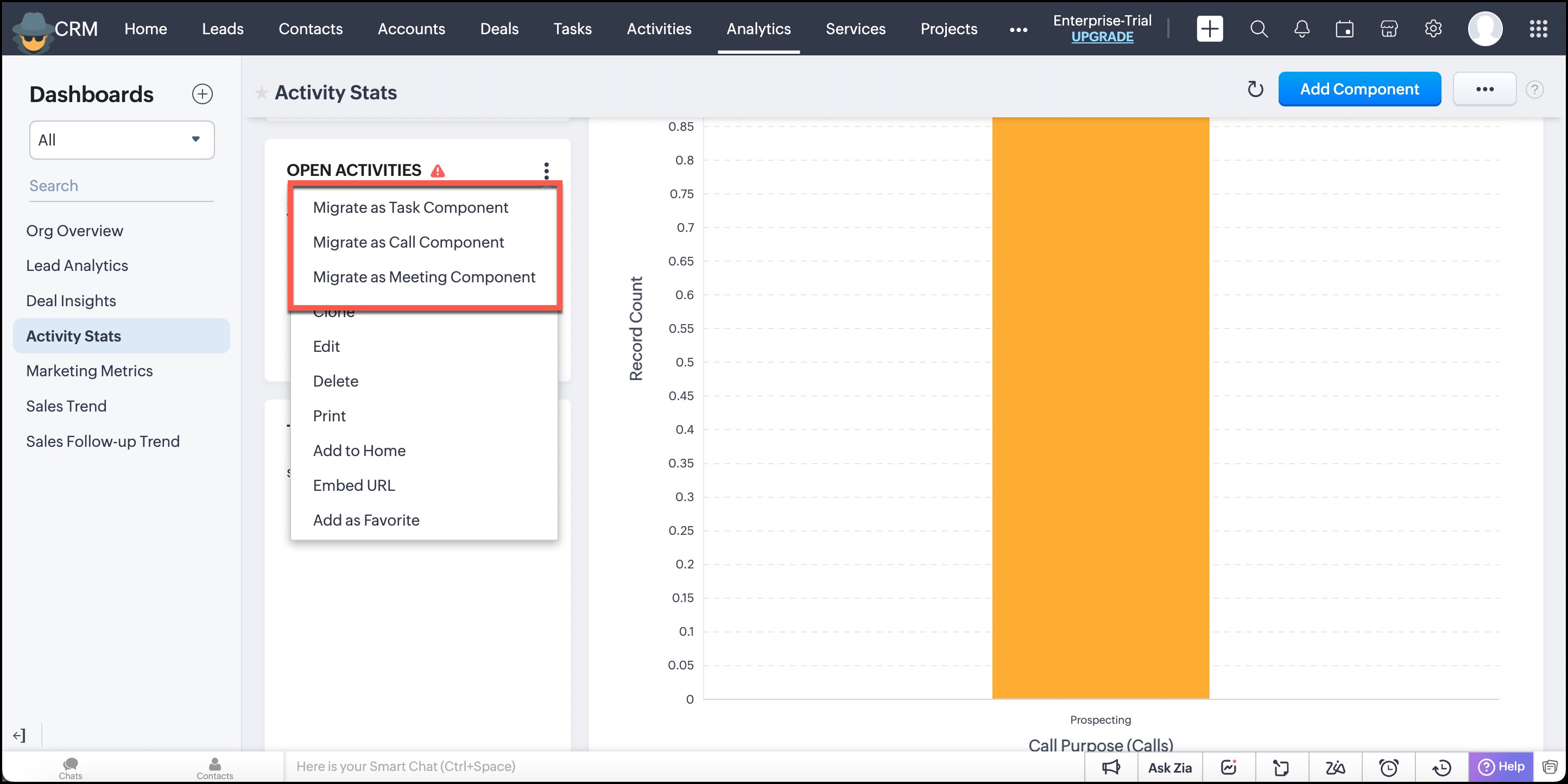 Scenario 2: If the dashboard component includes multiple criteria from the Activities module—for instance, if it has criteria and metrics from the Tasks, Calls, and Meetings modules—then the "Migrate as <module name> Component" option for the relevant Tasks, Meetings, and Calls modules will be displayed.