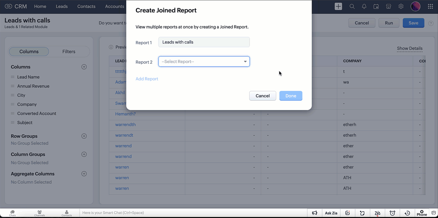 Joined Report: For example, you have a report "Leads with tasks and calls," created with tasks and calls. You can see the reports created in the tasks and calls modules individually, together as a joined report.
