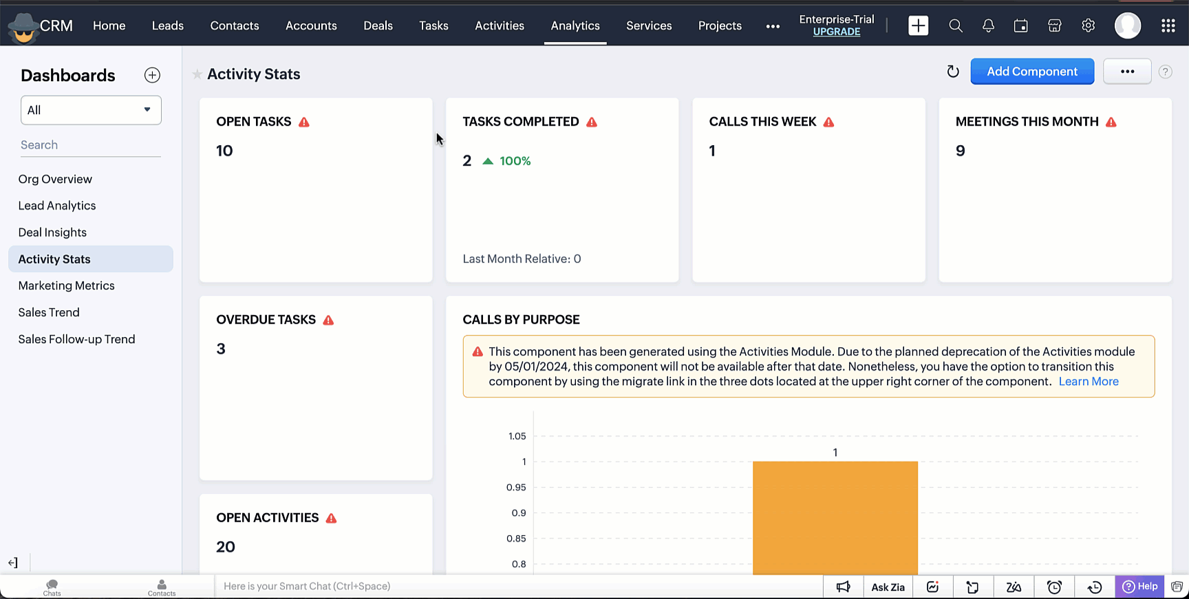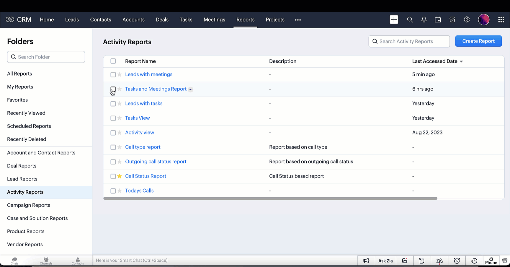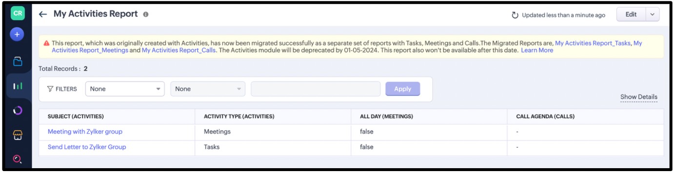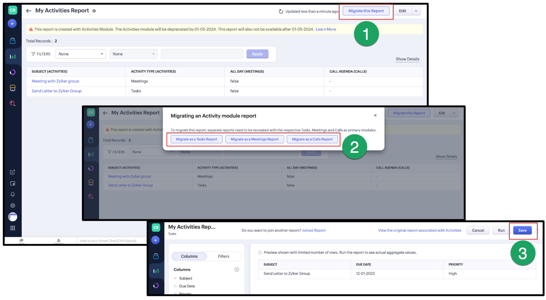 Similar to migrating dashboard components, you can also migrate reports associated with the Activities module to the relevant Tasks, Calls, and Meetings modules based on the report's criteria.
