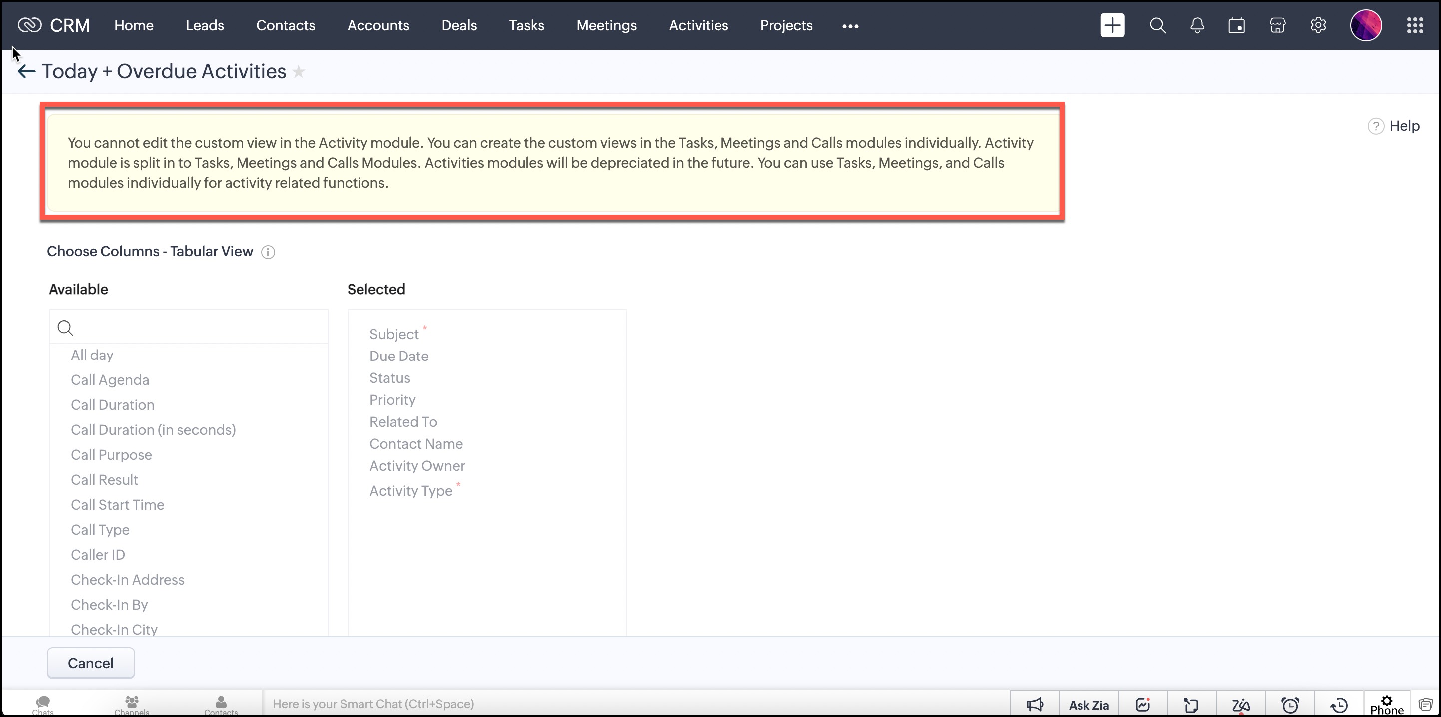 Effective March 15, 2024, we will deprecate the Activities tab in Zoho CRM. Please note that you can continue to view and work with your Activity records through the existing individual modules—Tasks, Meetings, and Calls—even after the Activity tab's deprecation.