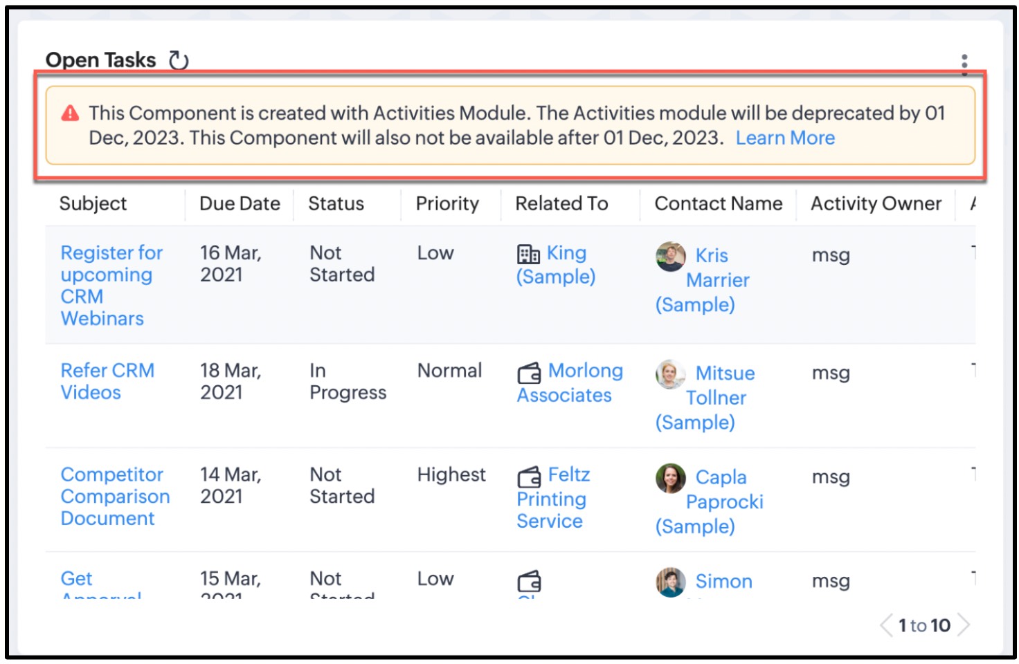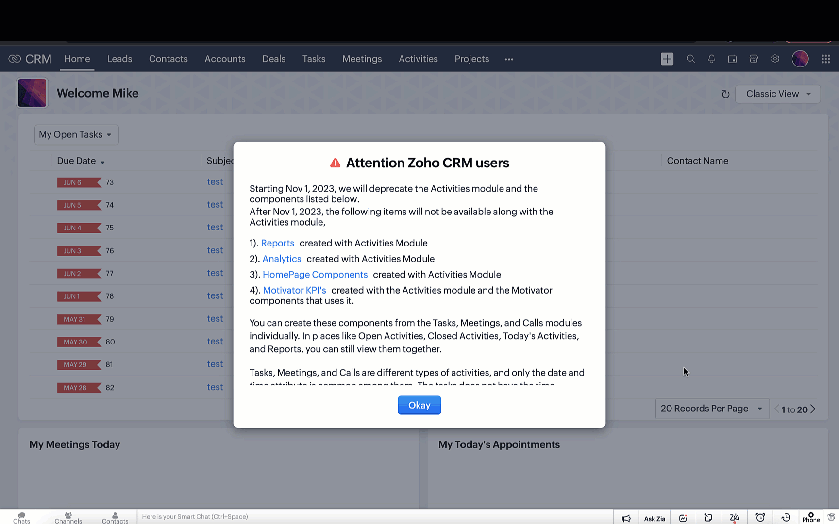 When you sign into Zoho CRM for the next few months, a large popup banner will display the list of Activities module components that will be impacted by the deprecation of the Activities tab, which are as follows: