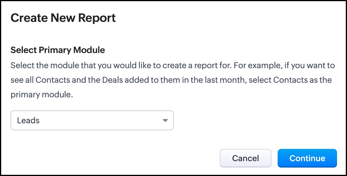 - For example, if you have an existing report as "Leads with Tasks", then choose Leads as the primary module and Tasks as the secondary module.