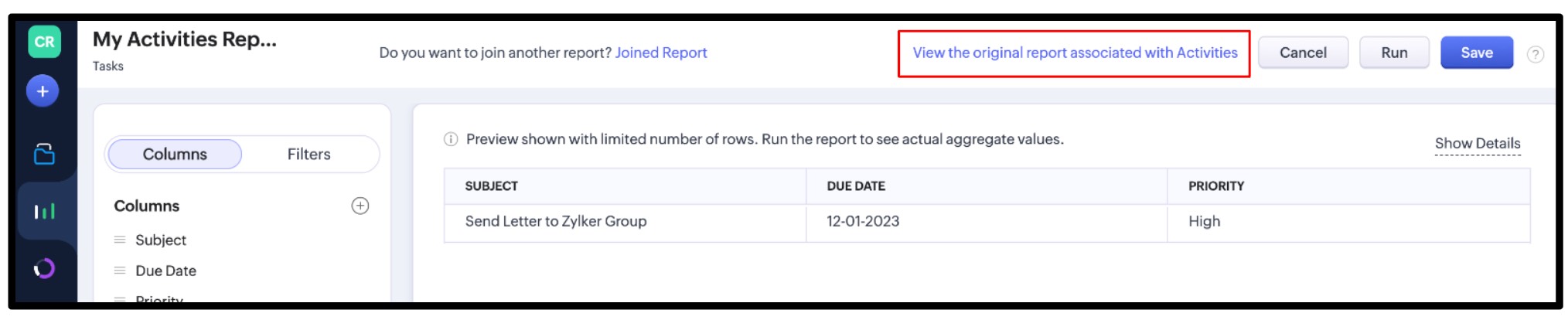 Before saving the migrated report, you can review the original report linked to the Activities module. This enables you to confirm whether the criteria of the newly migrated report matches the original report associated with the Activities module.