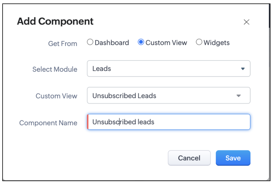 Furthermore, if you've reached the maximum threshold of 20 components on a dashboard page, the CRM system will notify you and assist in selecting an alternative module for relocating your component.