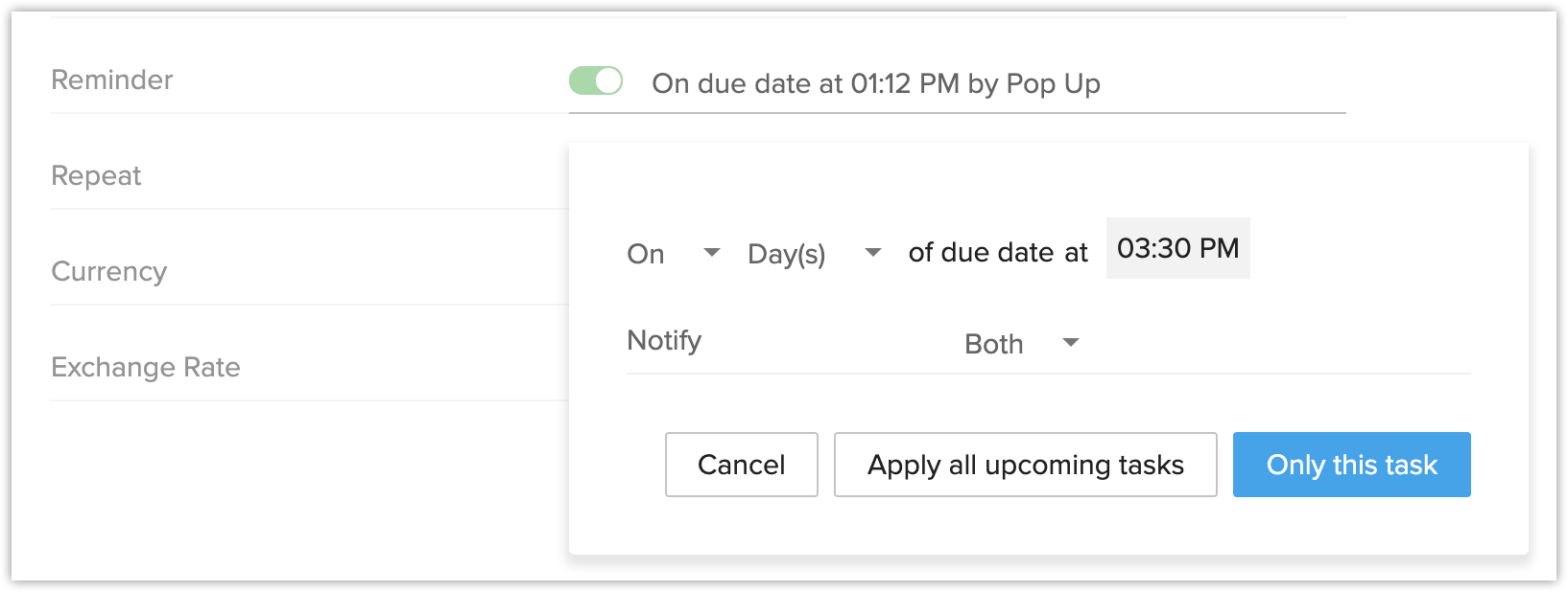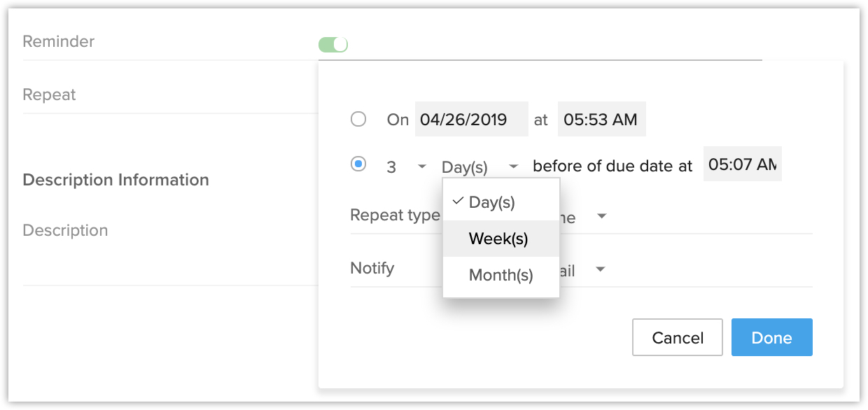 Following are the list of Zoho defined standard fields available in the Tasks module: