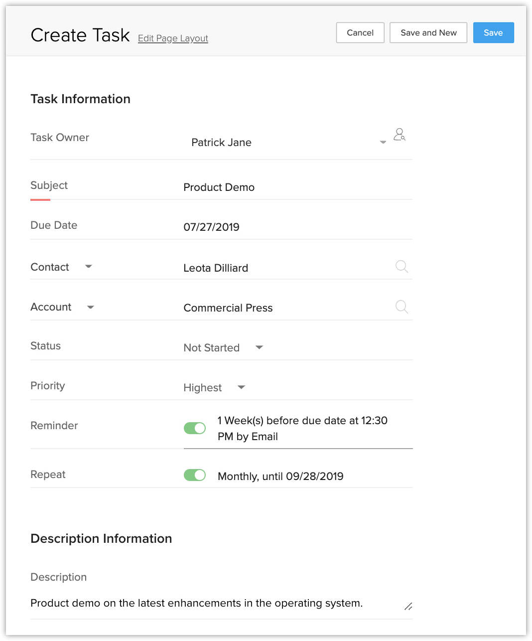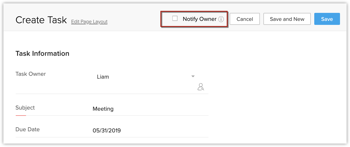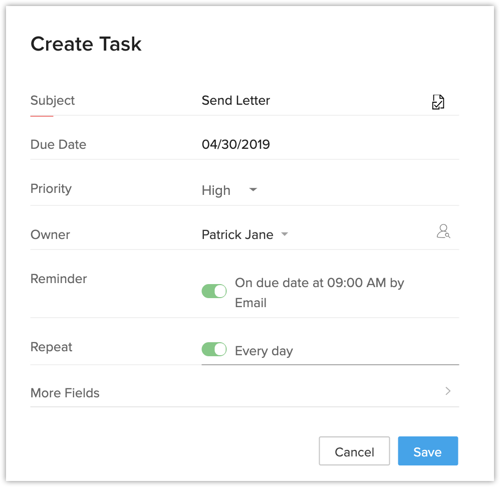 A task is a piece of work that is usually time bound. In Zoho CRM, tasks are listed in the record's Home page, Task's home page, and in other related records. While creating a task in CRM, you must enter task details such as Subject, Task Owner, Due date, and the contact or account to which the task is related to. You can also add custom fields to the Tasks module.