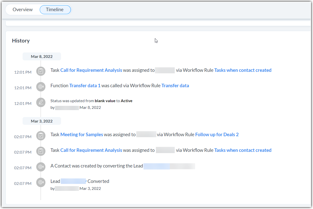 2. Timeline : Displays a history of actions performed on the contact's details page (in the last six months).