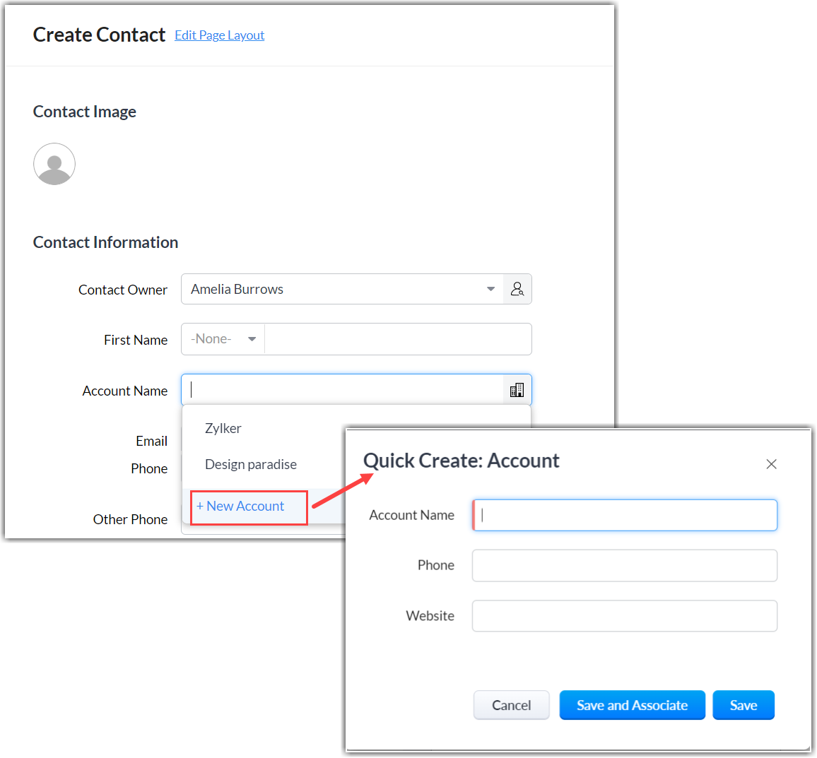 2. Click Save & Associate to save the new record and also associate it to the contact that you were creating.