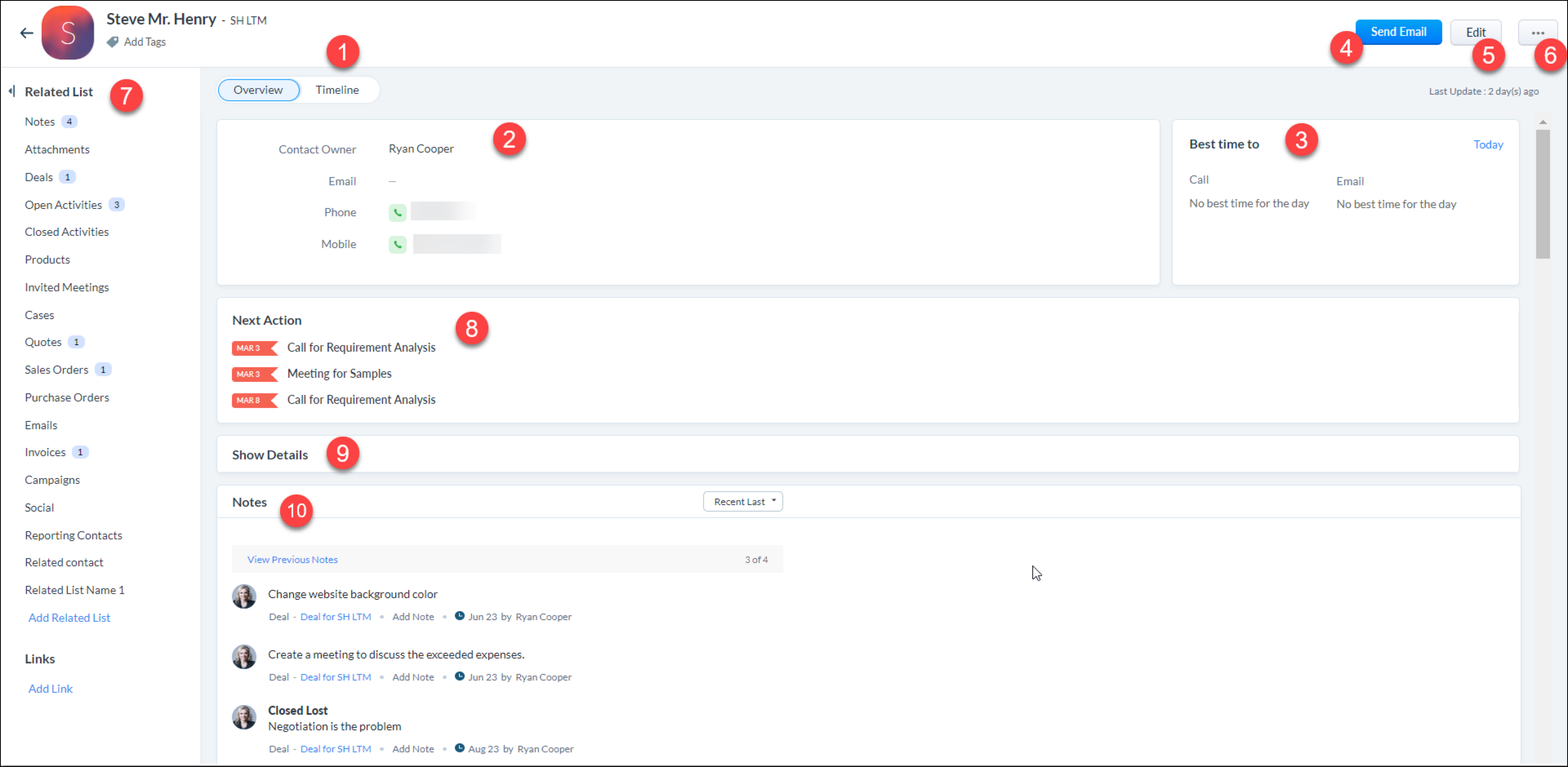You can create a 360-degree view of the contact to display all the associated details, such as deals, trouble tickets, open activities, history of the completed activities, attachments, and notes.