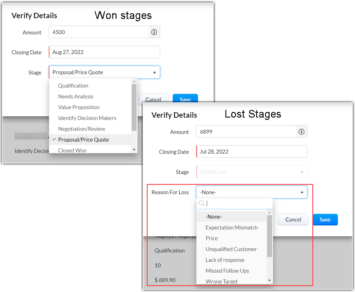 - Consider you want to generate a report on lost deals, there you can use this "Reason for loss" field to generate more accurate reports.