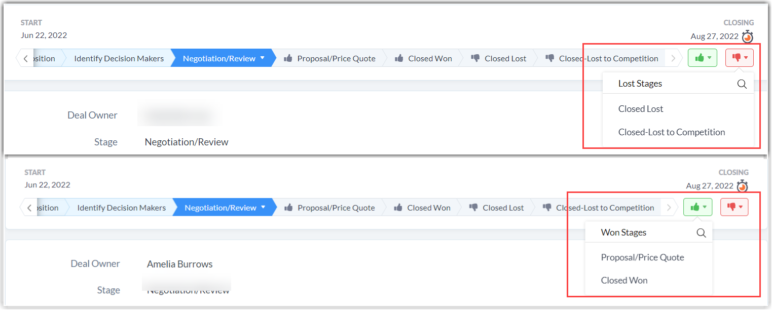 The stages labelled as closed won and closed lost will be listed under won and lost groups on the record detail page with an icon for easier identification. Won stages are shown by a green thumbs-up icon, whereas lost stages are indicated by a red thumbs-down icon.