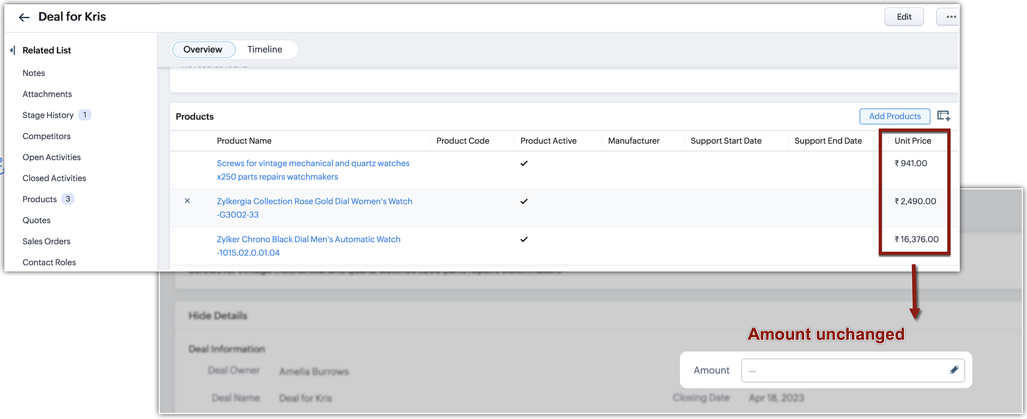 - Please note that the unit prices of the products included in a deal will not be automatically added up and displayed in the Amount field.
