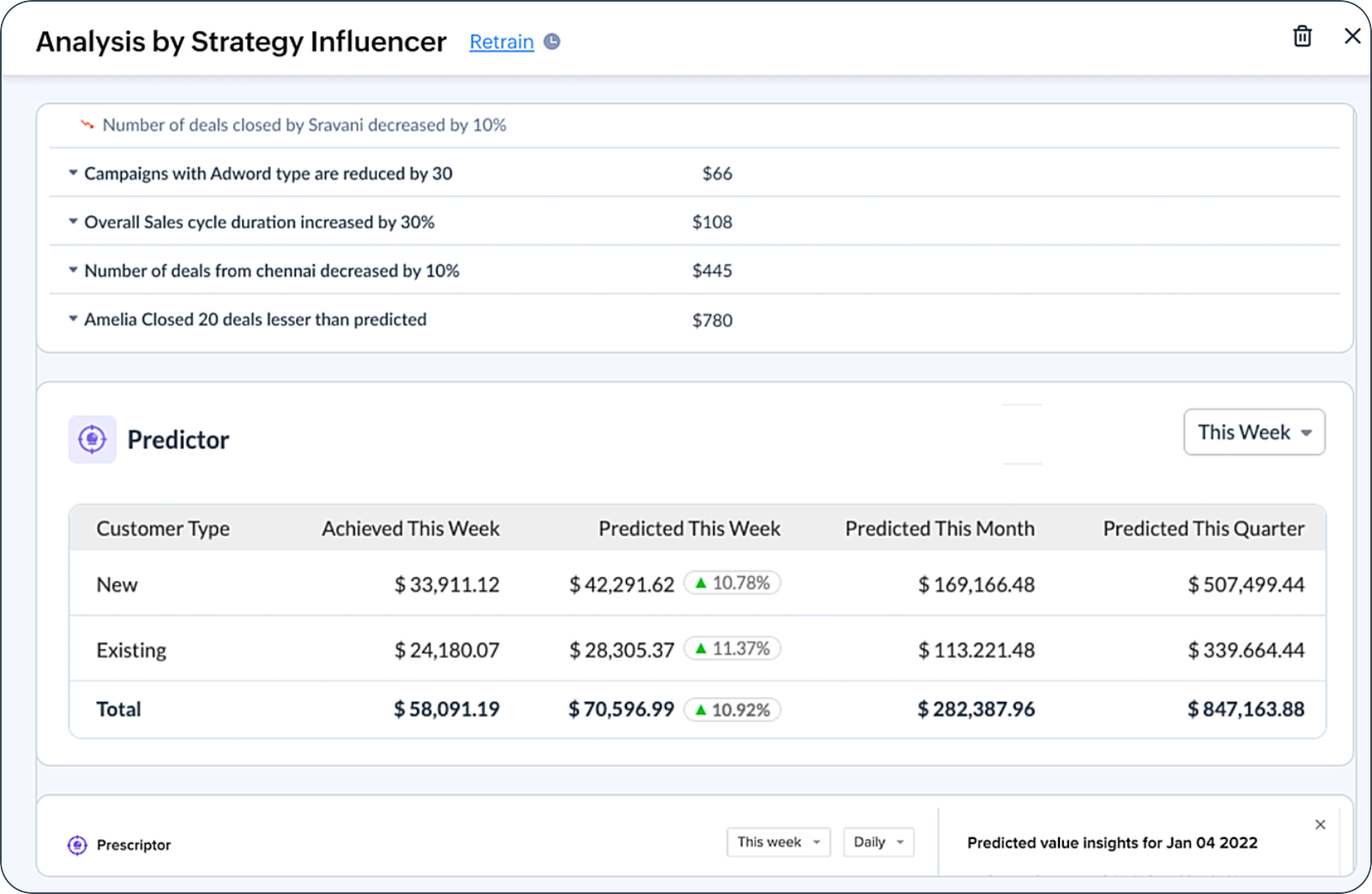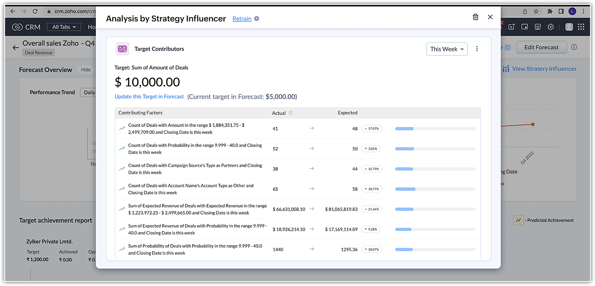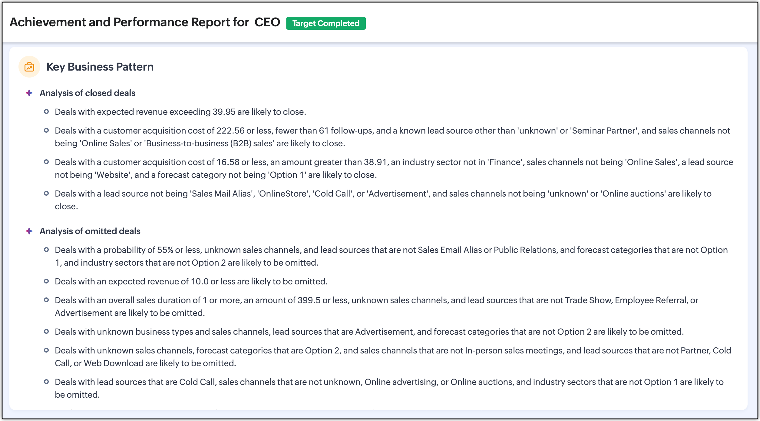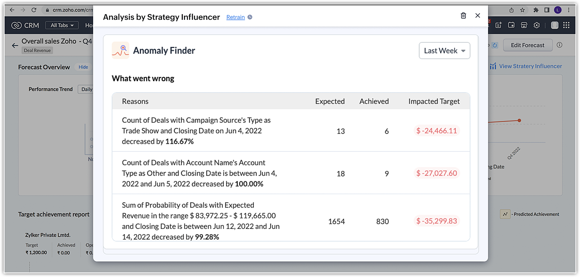 Zoho CRM's Strategy Influencer includes diverse analytics that depict organizational trends and patterns. It presents anticipated targets, anomalies, the reasons for unmet targets, and solutions to attain targets. By utilizing these insights, you can understand your enterprise's overall performance and develop effective strategies to improve it.
