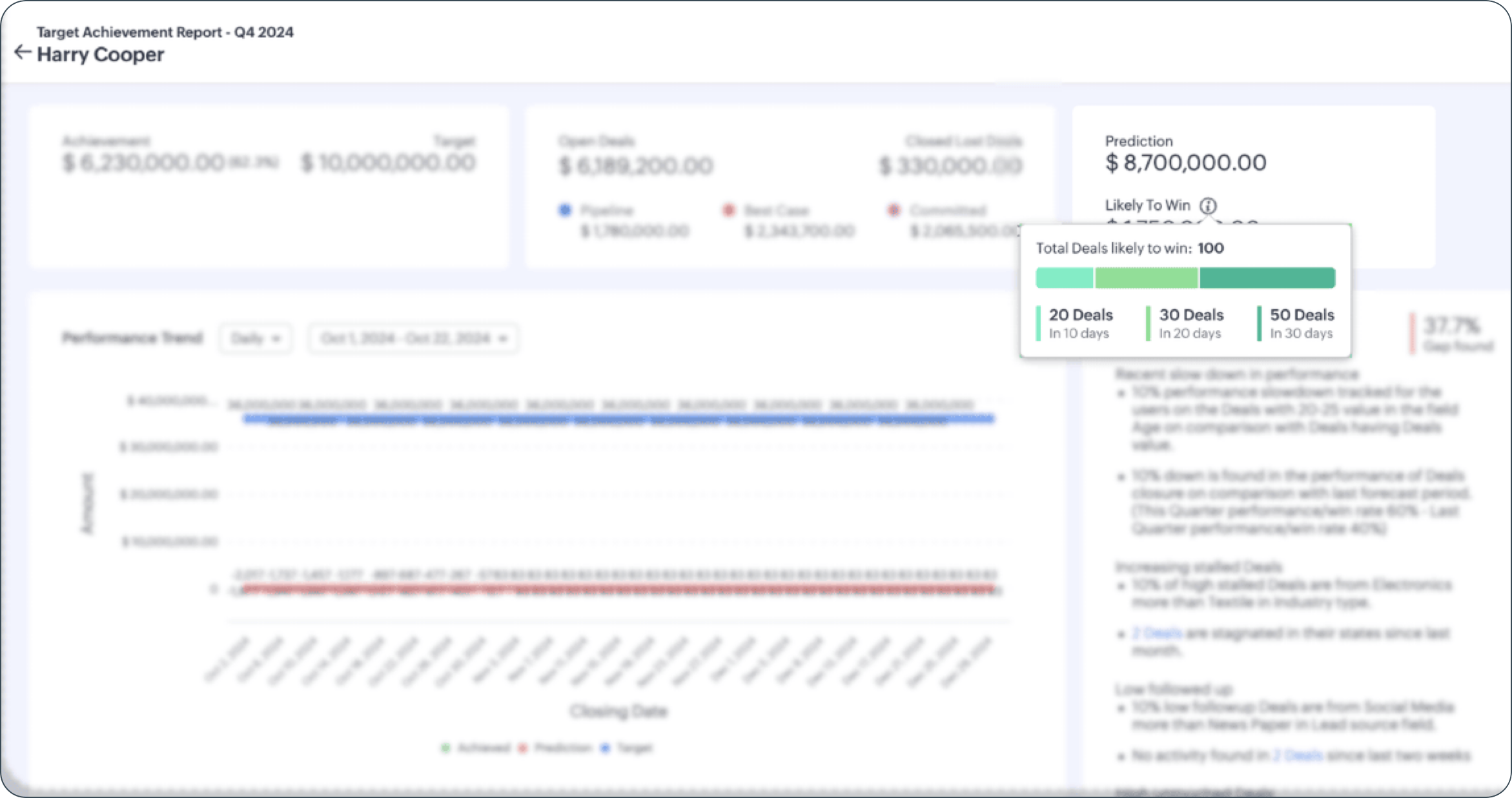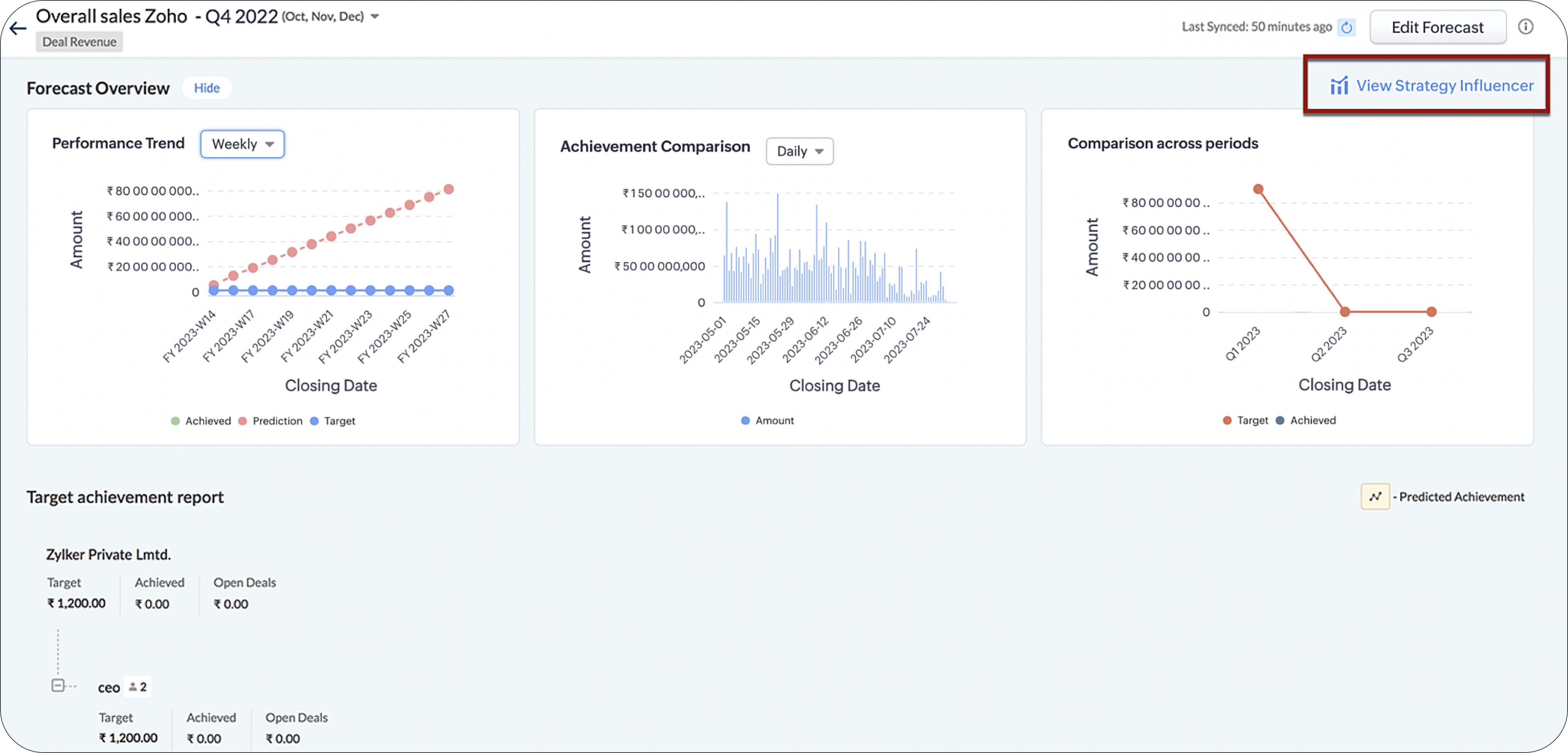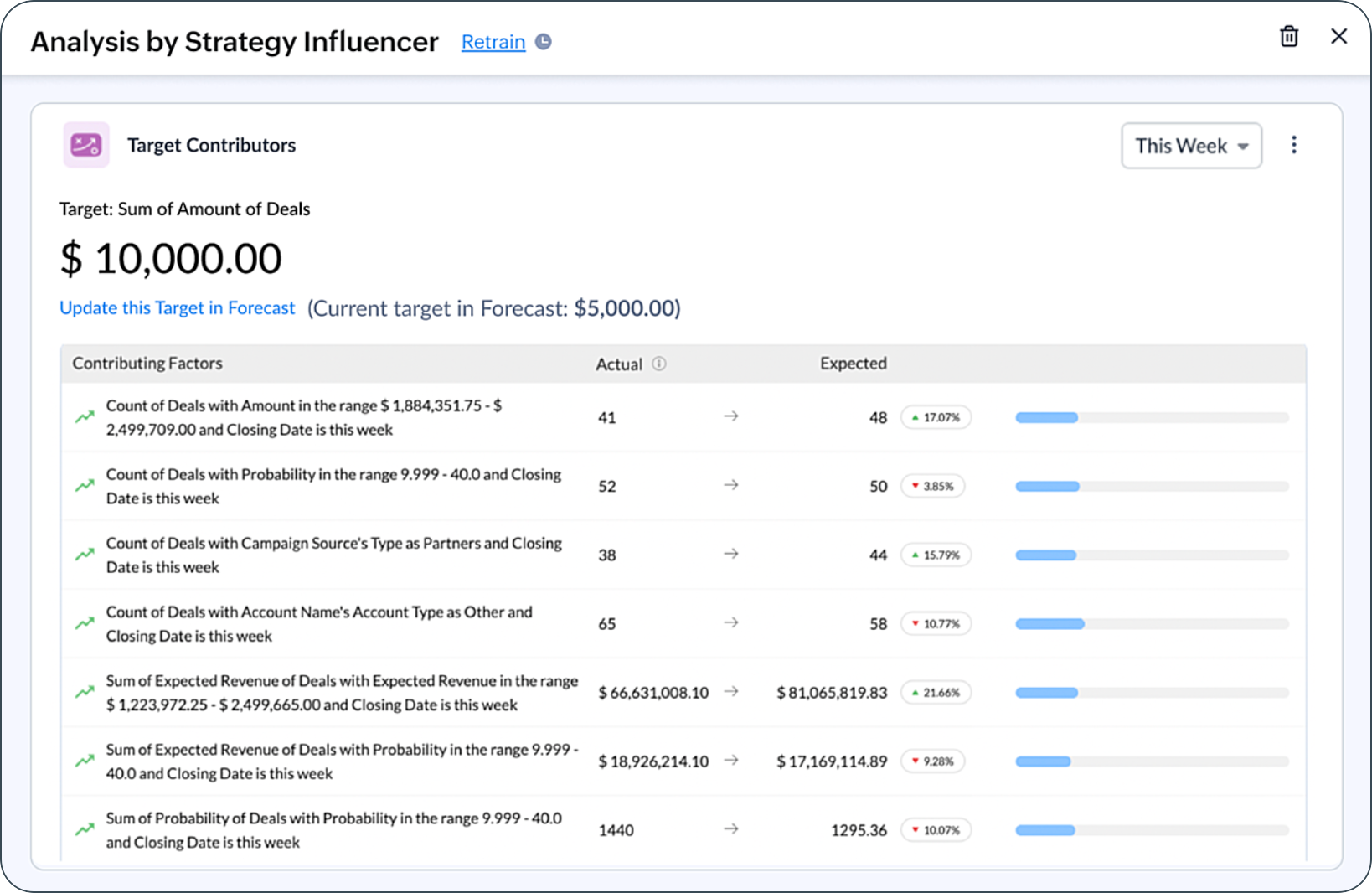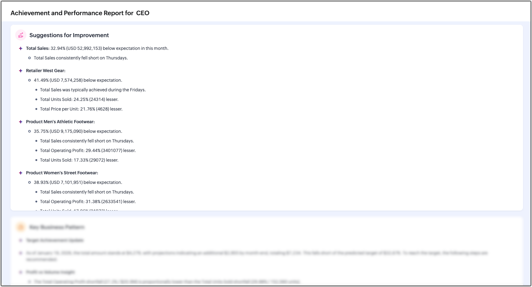 Zoho CRM's Strategy Influencer includes diverse analytics that depict organizational trends and patterns. It presents anticipated targets, anomalies, the reasons for unmet targets, and solutions to attain targets. By utilizing these insights, you can understand your enterprise's overall performance and develop effective strategies to improve it.