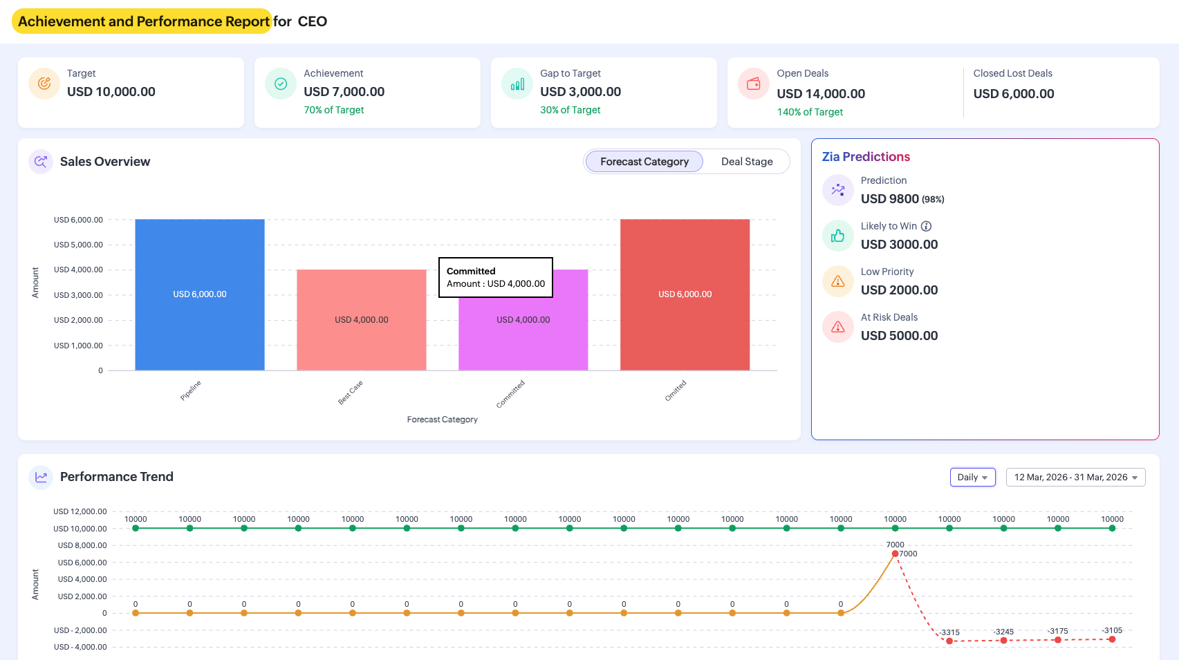 Also, the revenue prediction for the open deals in the given forecast period is displayed as a component along with the likely to win factor substantiating the prediction.