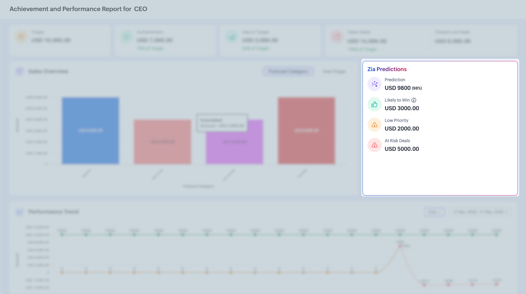 To predict target achievement, Zia requires data from the past six months that includes deals that were won on different days. The deals must be closed on at least 10 different days. In other words, if all the deals are closed on the same day, the prediction cannot be made. The predicted achievement for individual users, roles, and territories will be displayed next to their achievement in the target achievement report. It will be based on the past six months of data and the current deal closure trend.