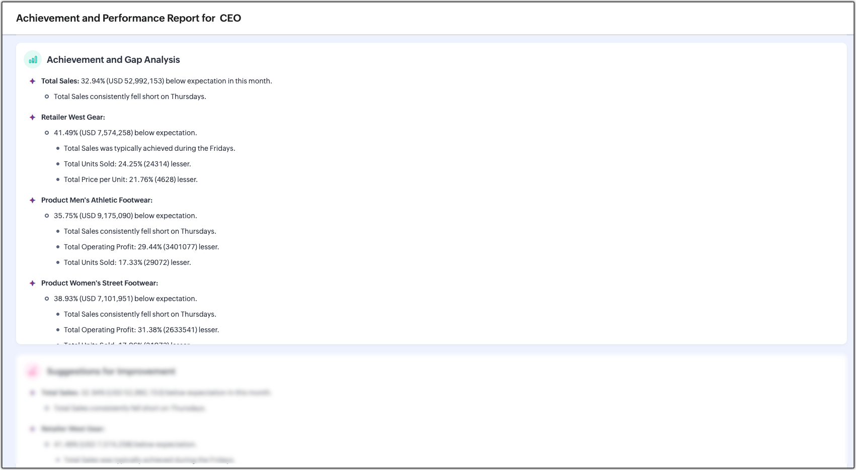 The Anomaly Finder scrutinizes the presence of anomalies in the attained value for a given period, and elaborates on the factors behind them, the anticipated versus actual targets, and the extent of their influence on the target.