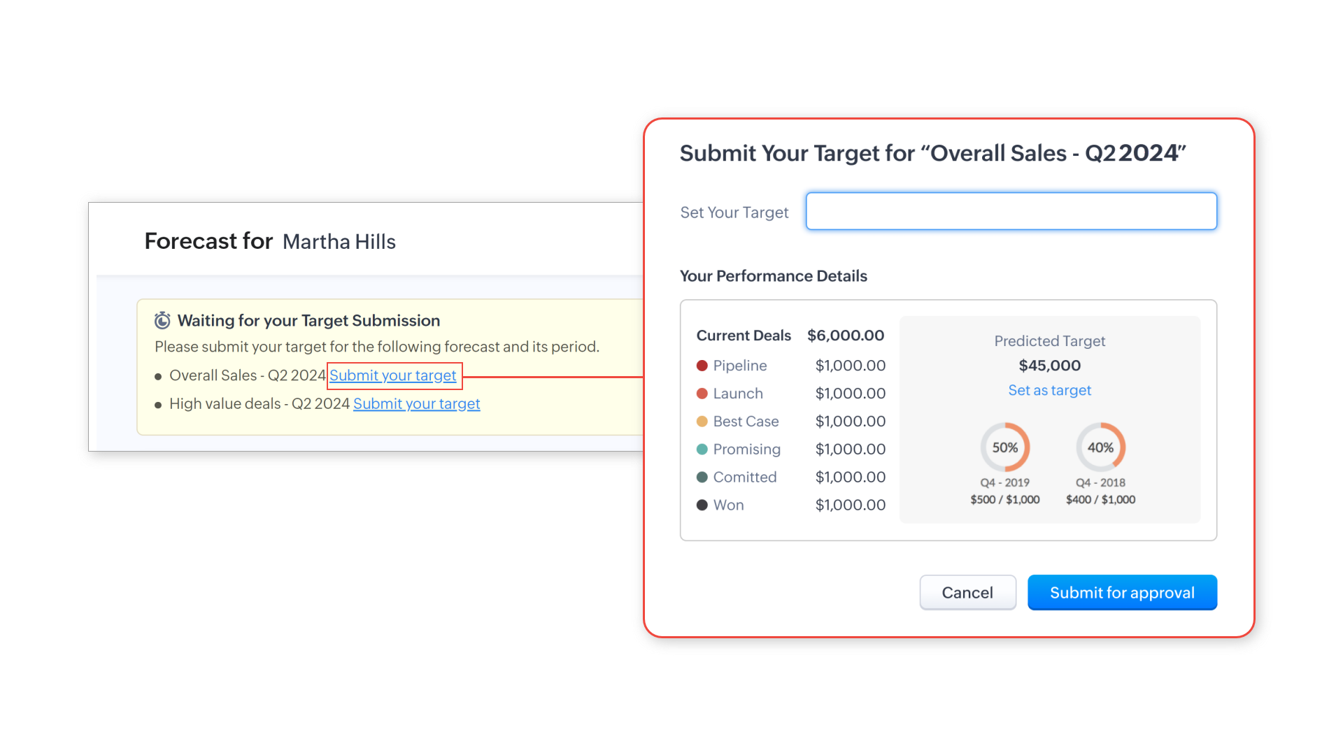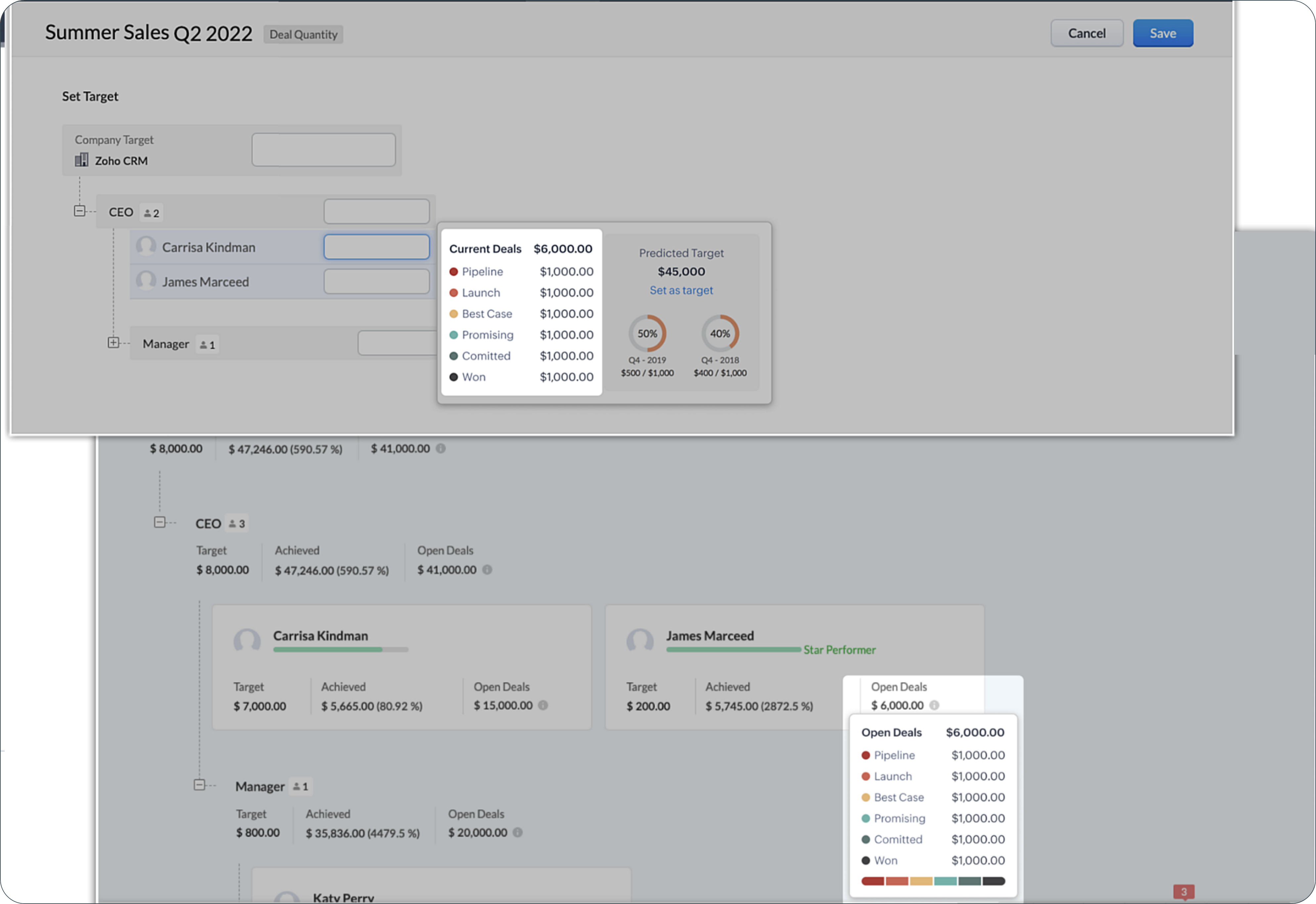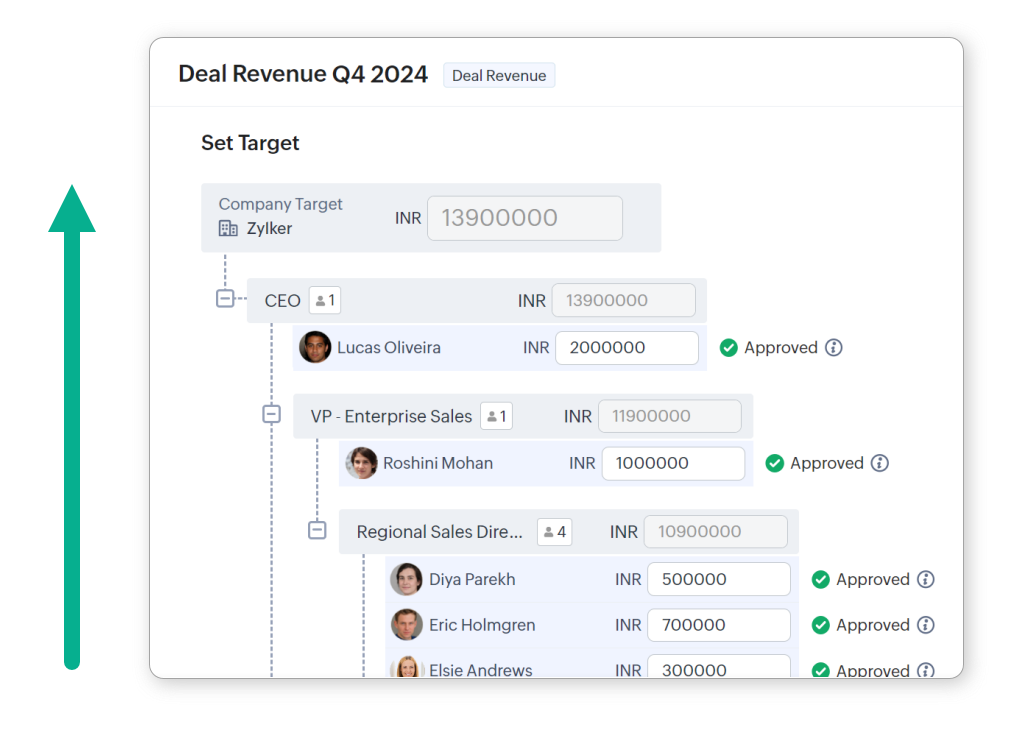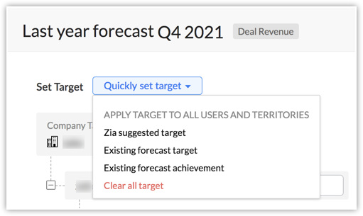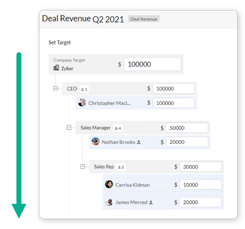 - In the top-down model, the target is set for the business as a whole by a small group of managers or a forecasting team. This target is then dis-aggregated across different roles/territories/managers and users. In Zoho CRM, admins and users in the highest role/ position set the overall target. Targets for lower levels of the hierarchy are usually set by forecast managers by splitting up this overall target.